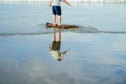 茜色の海辺を走る子ども