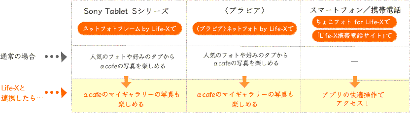 さらに、αcafeとLife-Xを連携することで、あなたのマイギャラリーの写真も、Tabletの快適な操作性でかんたんに閲覧することができるようになります。