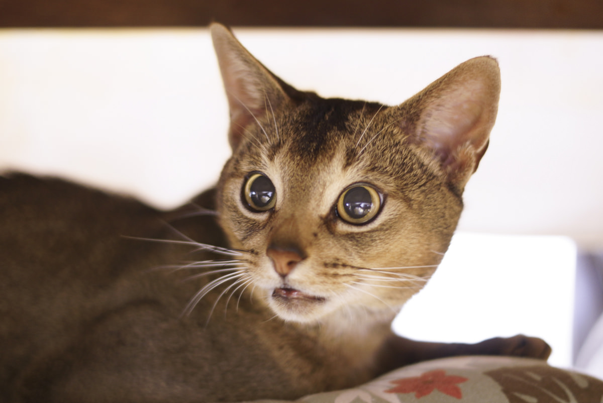躍動的な感じがすごくいいなと思いました。この状況のなかで両目がピシッと写っている。右手のブレ具合で躍動感が出ているのもいい。すごく猫が好きでたくさん撮っている人が「今日は絶対に良い写真を撮ってやるぞ」と、撮った写真だと思いました。青空もきれいに仕上がっていると思います。広角レンズを使っているけど開放で使わないとこんなふうにピントは合わないし、アングル、レンズの使い方、とてもレベルが高いです。
