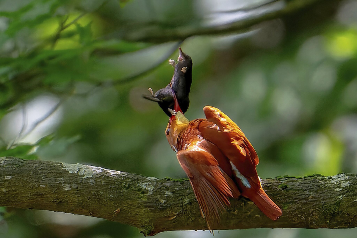 頑丈な枝上のステージに光が注いでいる。そこには美しく輝くアカショウビンがいて、くわえられた獲物はなす術なく宙に踊っている。光線やアングルが、計算されたかのように素晴らしい。食う者と食われる者、厳粛な野生の掟を切り取ったこの秀作は、作者が多くの時間と労力をフィールドで費やした証であろう。そうした作者に心から敬意を表したい。