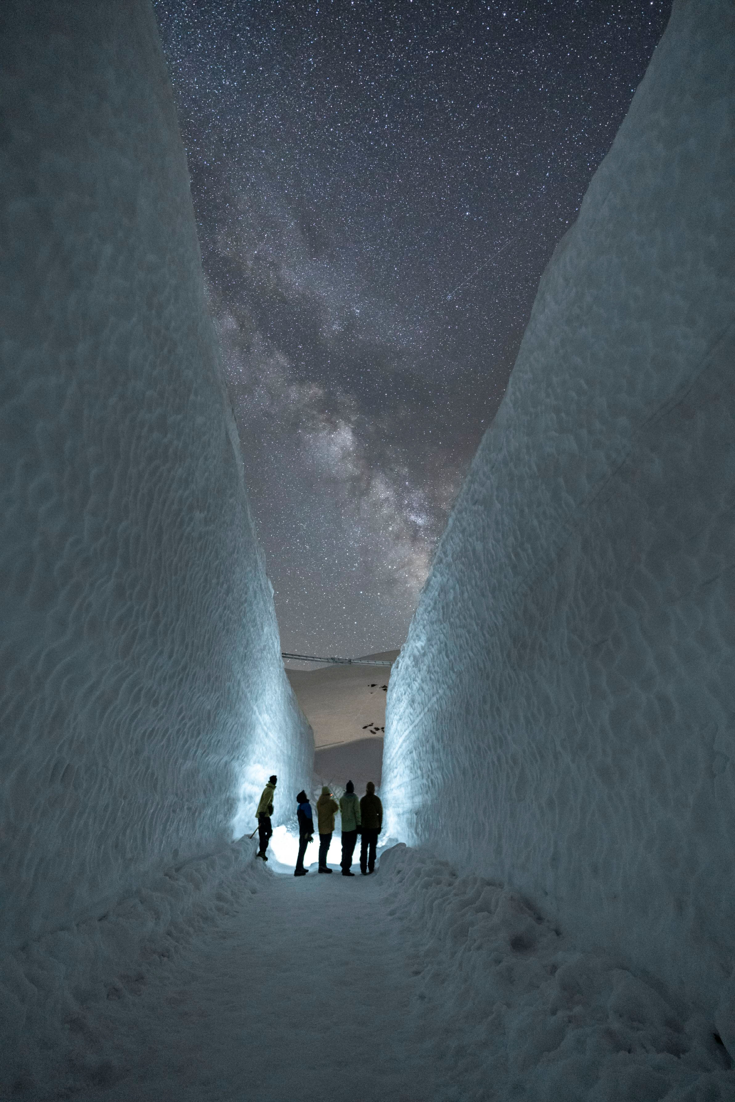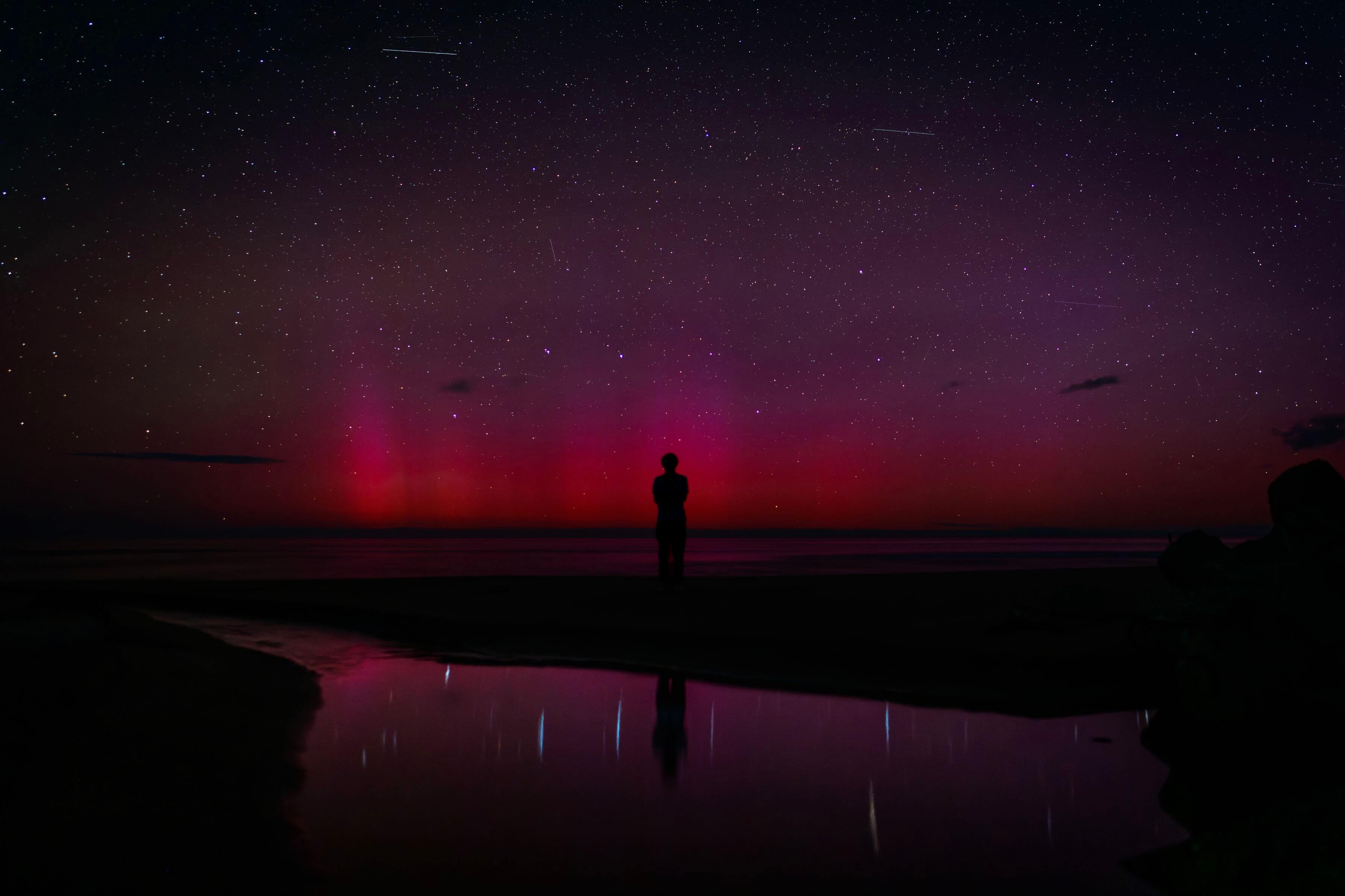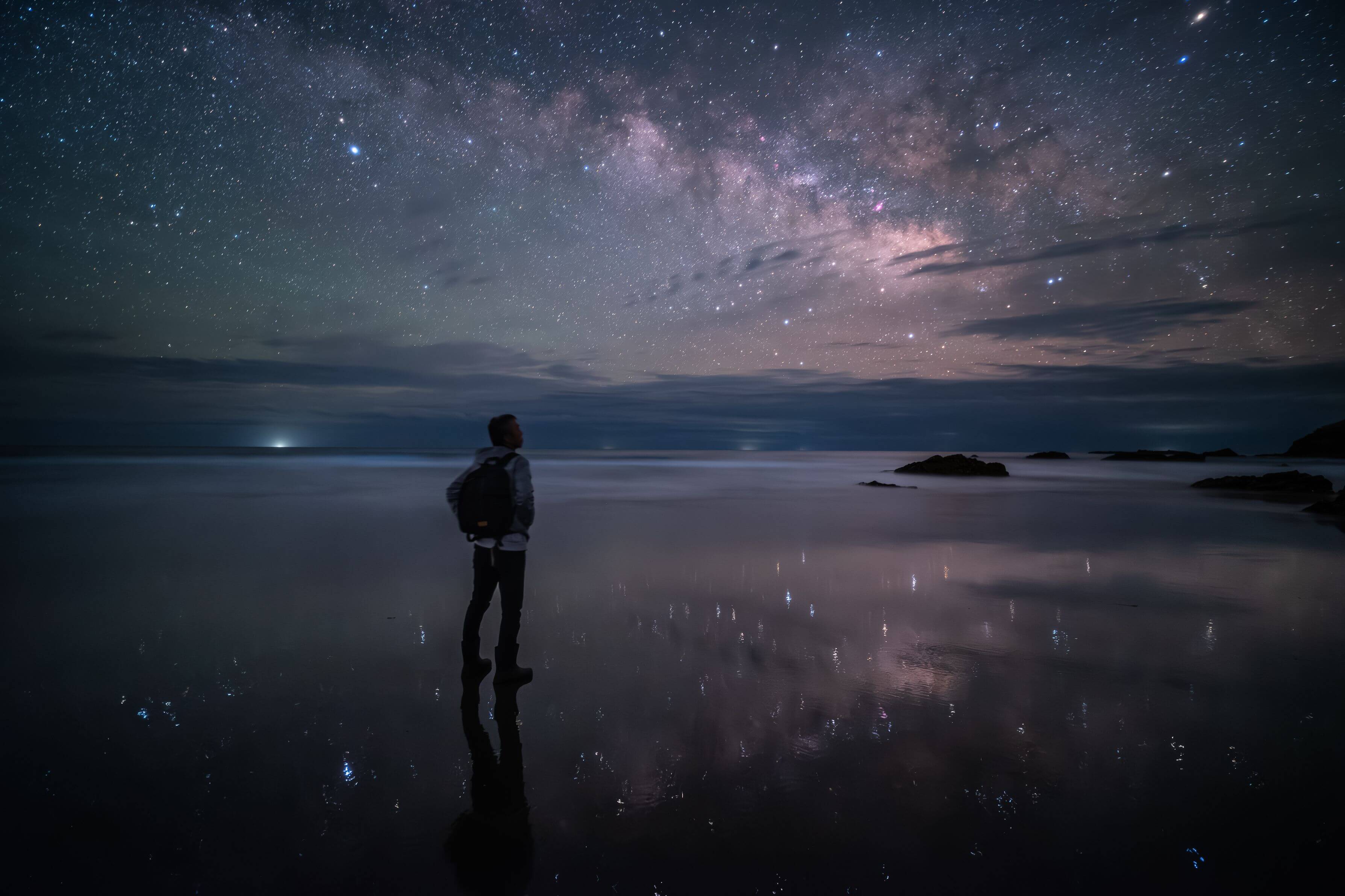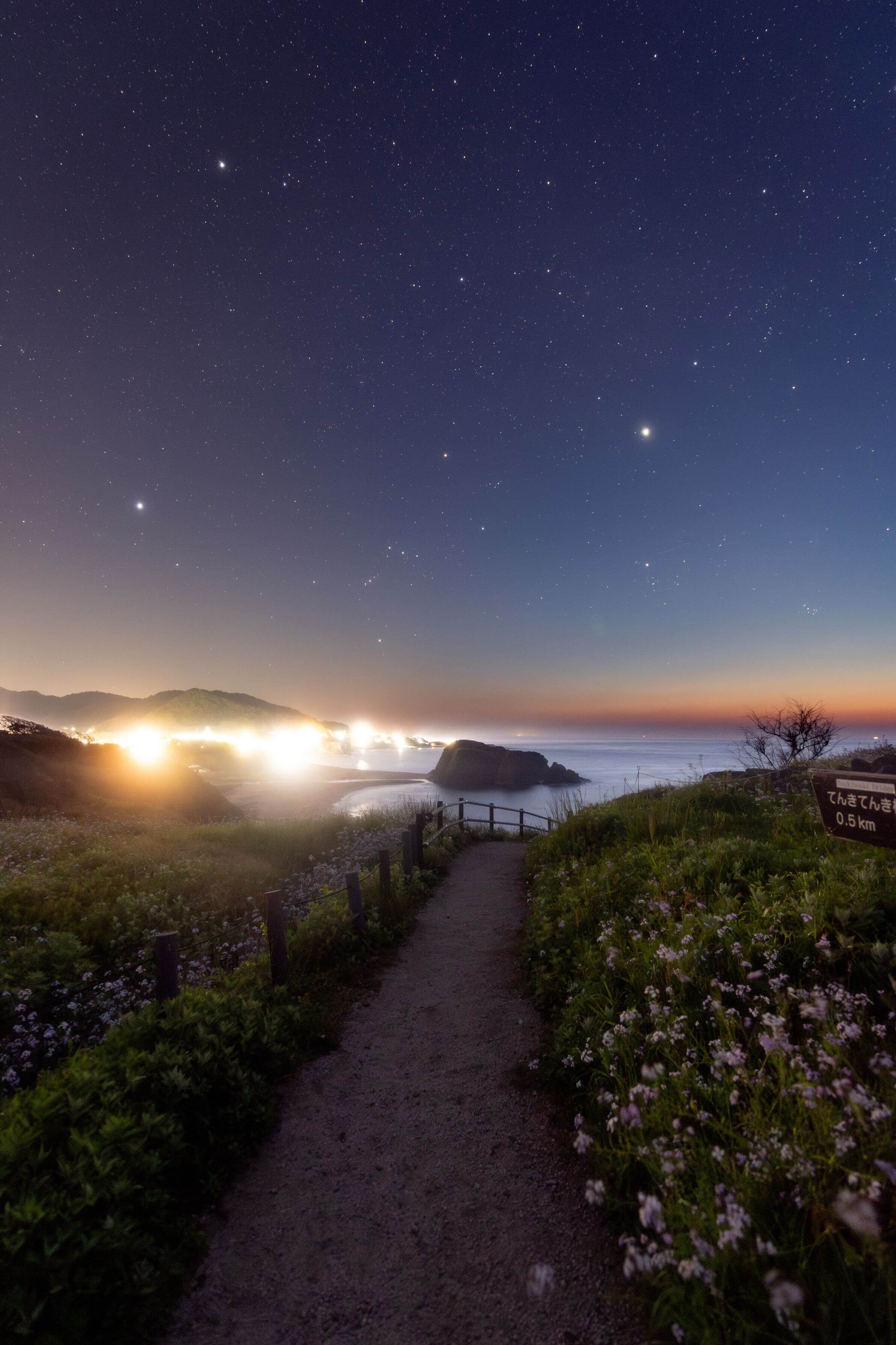 - 東の空から昇ったばかりのいて座からわし座にかけての天の川が、鏡のようになった水面に映って、上下左右360度星空に包まれたような幸せな光景です。「日本のウユニ塩湖」と呼ばれる場所は各地にありますが、風のない静かな夜、遠浅の砂浜に薄く潮が溜まるという条件が揃わないと星を映す水鏡は現れません。星空を見上げているのは同行の友人でしょうか? 超広角レンズのパースを活かした視線の広がりと、遮るもののない空間描写によって、こちらもいっしょに写真の中に入って星空を見上げているような気になってきます。