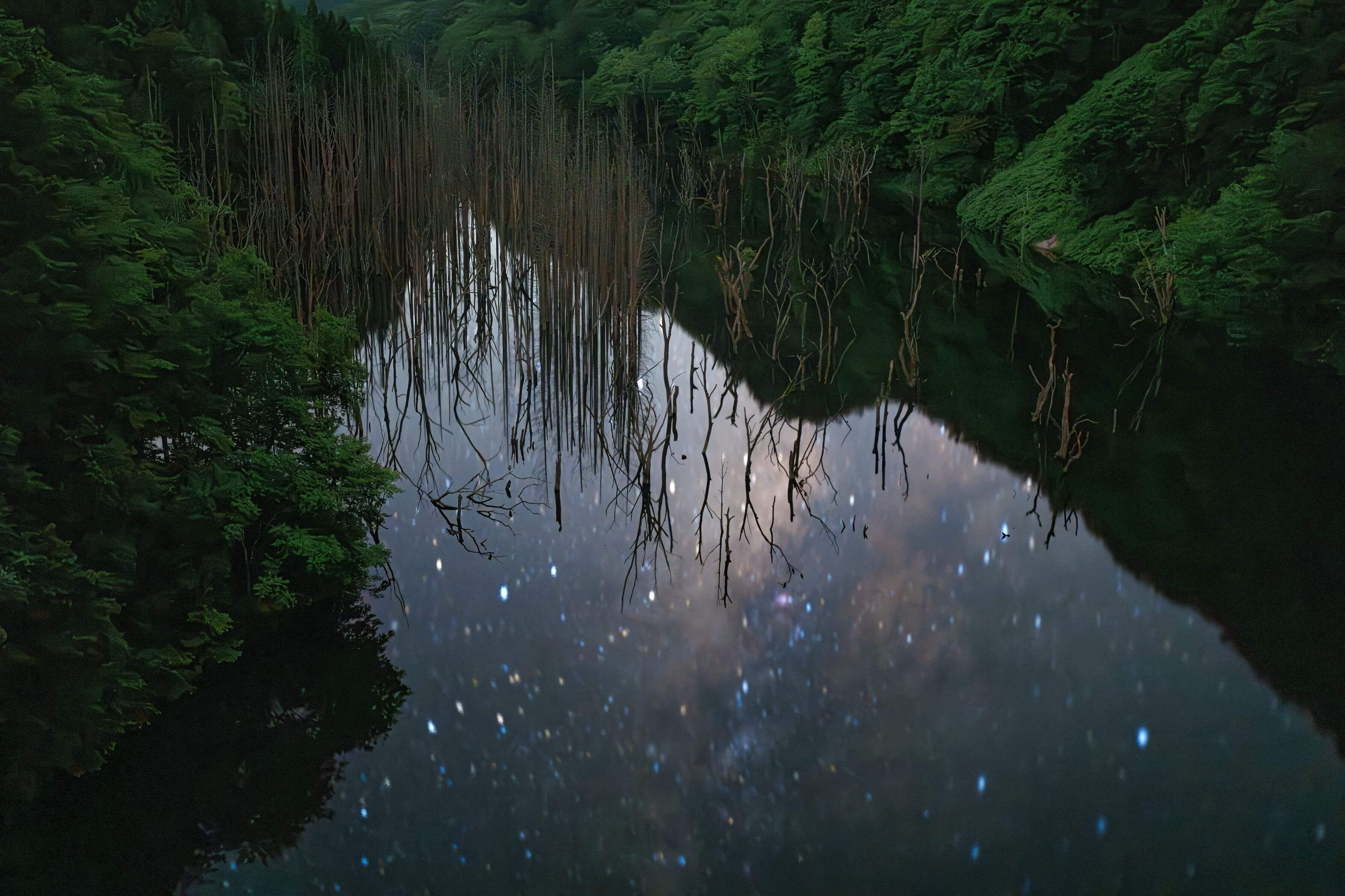 - マゼンタがかった星空と天の川が最も幅広く輝くいて座方向の天の川、それを背景にくっきりと存在感を示す樹木、そして星を写す水鏡。この場所が何処なのかは、私が目にするデータからは分かりませんでしたが、おそらくは北緯30度前後の地域であるようです。この印象的な光景は、とても素晴らしい出会いだったに違いありません。私としては、樹木と天の川が完全に重なっていないところ、樹木のシンメトリーな配置と、天の川の傾きが微妙にずれているところが、作品性をより高めていると感じました。