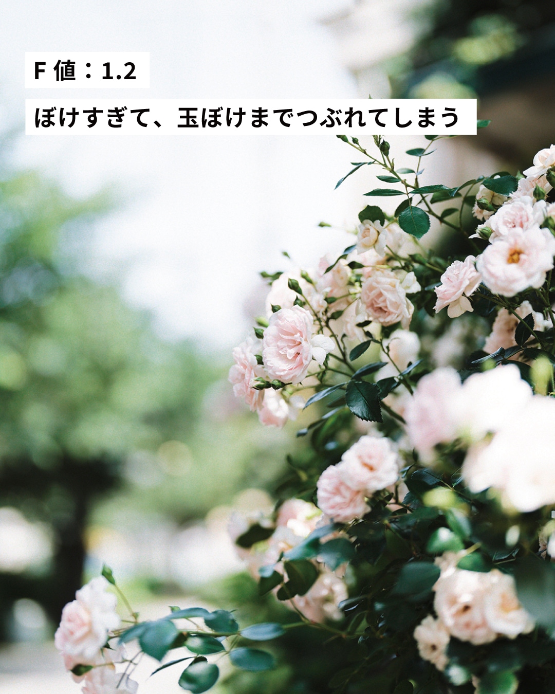 F値を小さくすることでぼけ感が出て、被写体に立体感が生まれます。前ぼけを入れると、より被写体を際立たせることができます。F2は、ぼけすぎず、綺麗な玉ぼけも出るので一番好きな設定です。