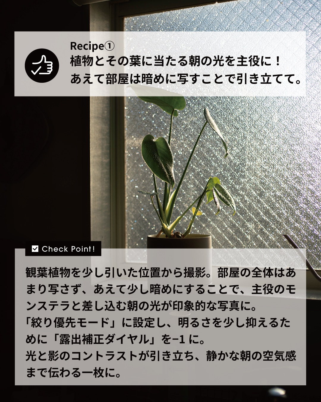 観葉植物を少し引いた位置から撮影。部屋の全体はあまり写さず、あえて少し暗めにすることで、主役のモンステラと差し込む朝の光が印象的な写真に。「絞り優先モード」に設定し、明るさを少し抑えるために「露出補正ダイヤル」を−1に。光と影のコントラストが引き立ち、静かな朝の空気感まで伝わる一枚に。