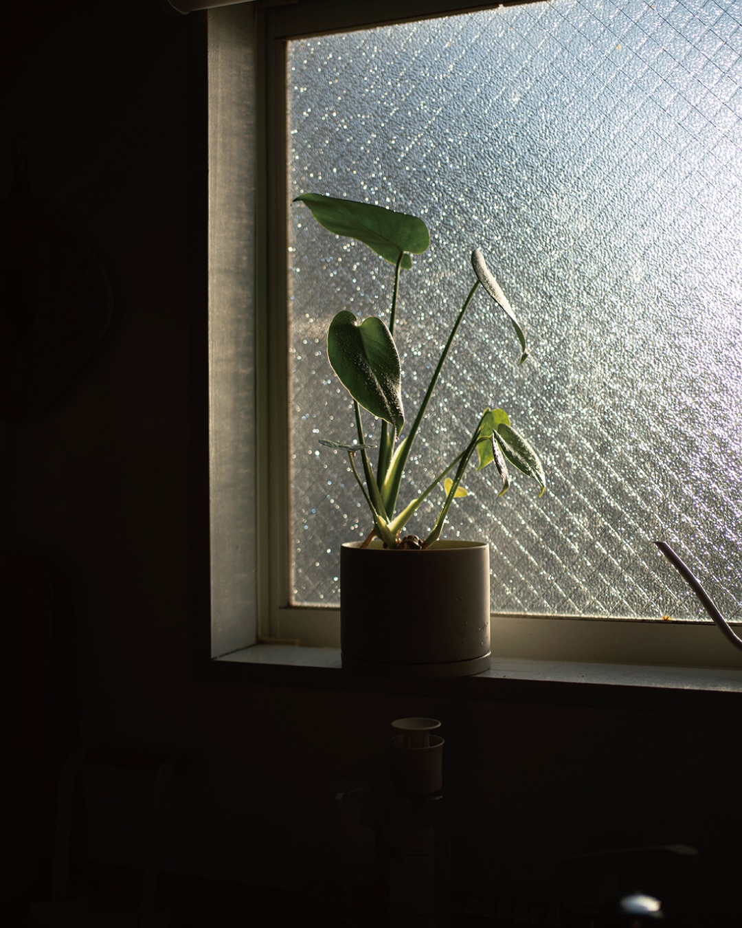 植物とその葉に当たる朝の光を主役に!あえて部屋は暗めに写すことで引き立てて。