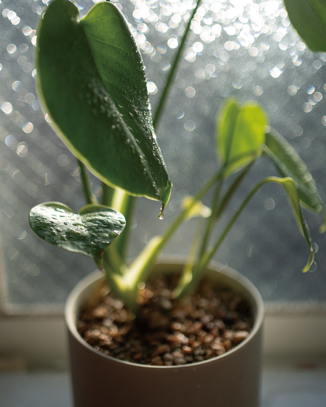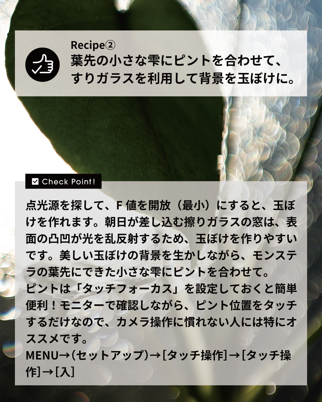 点光源を探して、F値を開放(最小)にすると、玉ぼけを作れます。朝日が差し込む擦りガラスの窓は、表面の凸凹が光を乱反射するため、玉ぼけを作りやすいです。美しい玉ぼけの背景を生かしながら、モンステラの葉先にできた小さな雫にピントを合わせて。ピントは「タッチフォーカス」を設定しておくと簡単便利!モニターで確認しながら、ピント位置をタッチするだけなので、カメラ操作に慣れない人には特にオススメです。