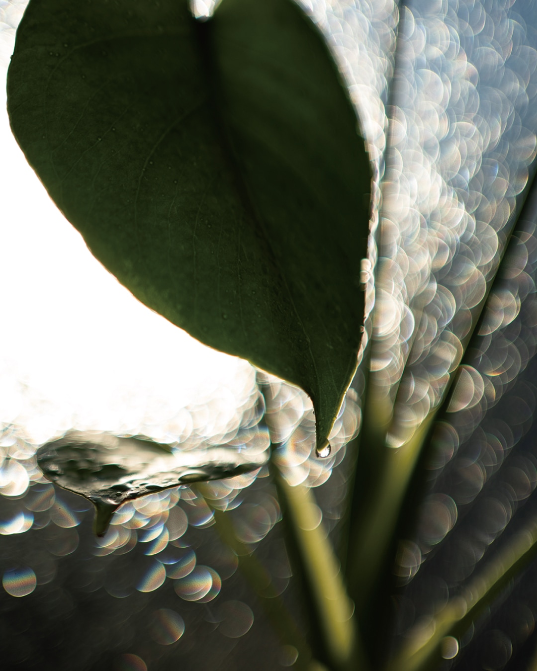 葉先の小さな雫にピントを合わせて、すりガラスを利用して背景を玉ぼけに。