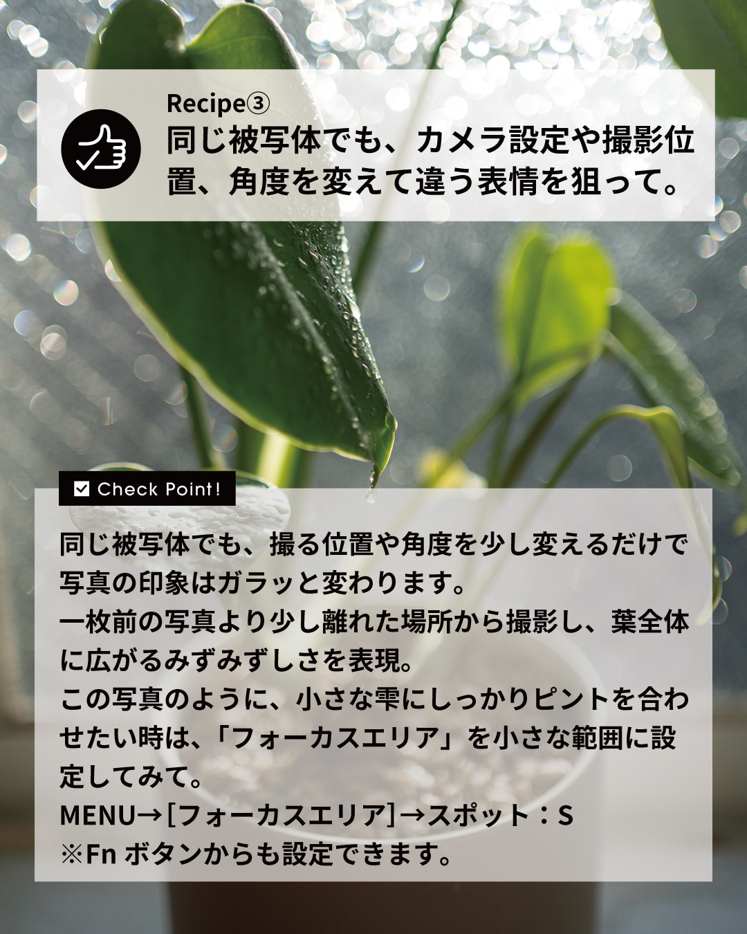 同じ被写体でも、撮る位置や角度を少し変えるだけで写真の印象はガラッと変わります。一枚前の写真より少し離れた場所から撮影し、葉全体に広がるみずみずしさを表現。この写真のように、小さな雫にしっかりピントを合わせたい時は、「フォーカスエリア」を小さな範囲に設定してみて。
