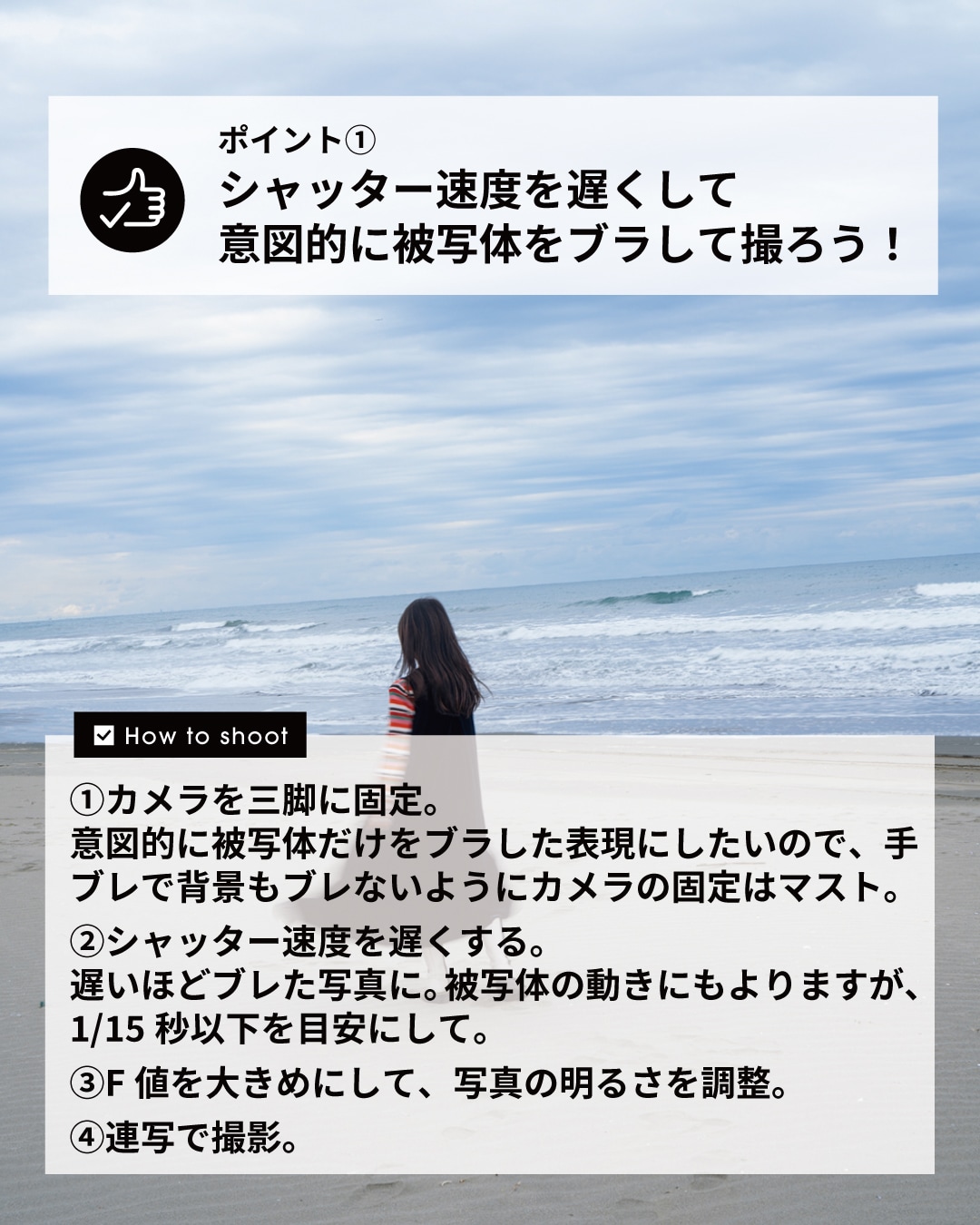 - シャッター速度を遅くする。遅いほどブレた写真に。被写体の動きにもよりますが、1/15秒以下を目安にして。