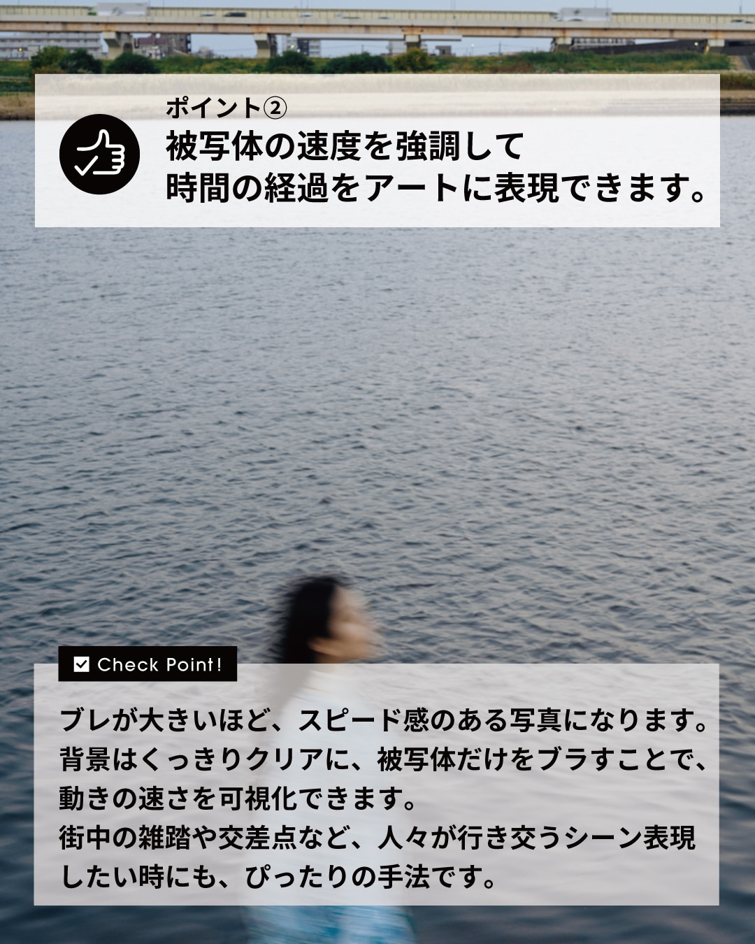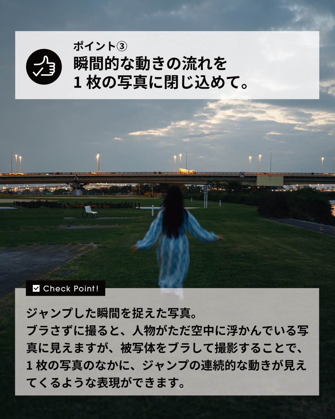 ジャンプした瞬間を捉えた写真。ブラさずに撮ると、人物がただ空中に浮かんでいる写真に見えますが、被写体をブラして撮影することで、1枚の写真のなかに、ジャンプの連続的な動きが見えてくるような表現ができます。