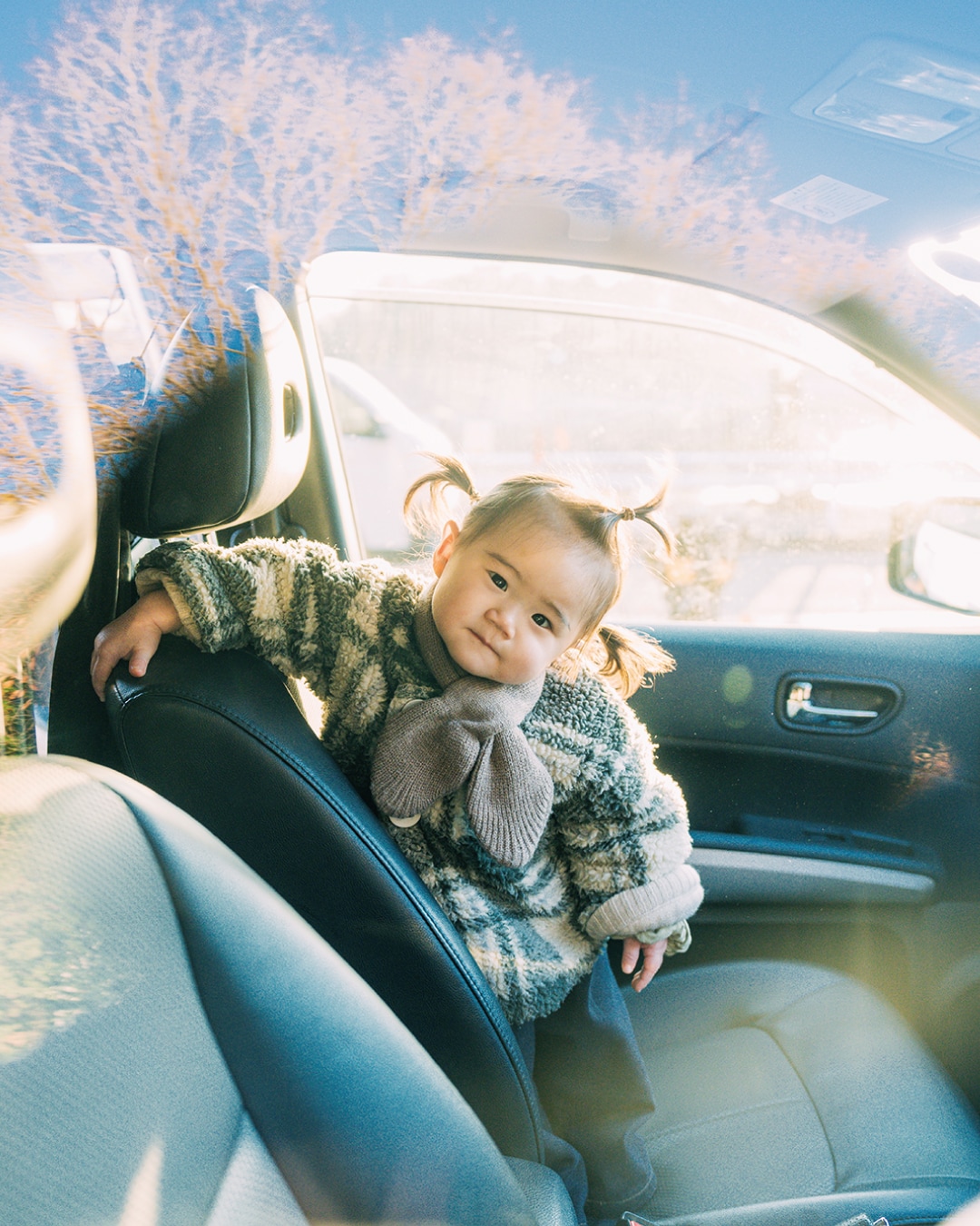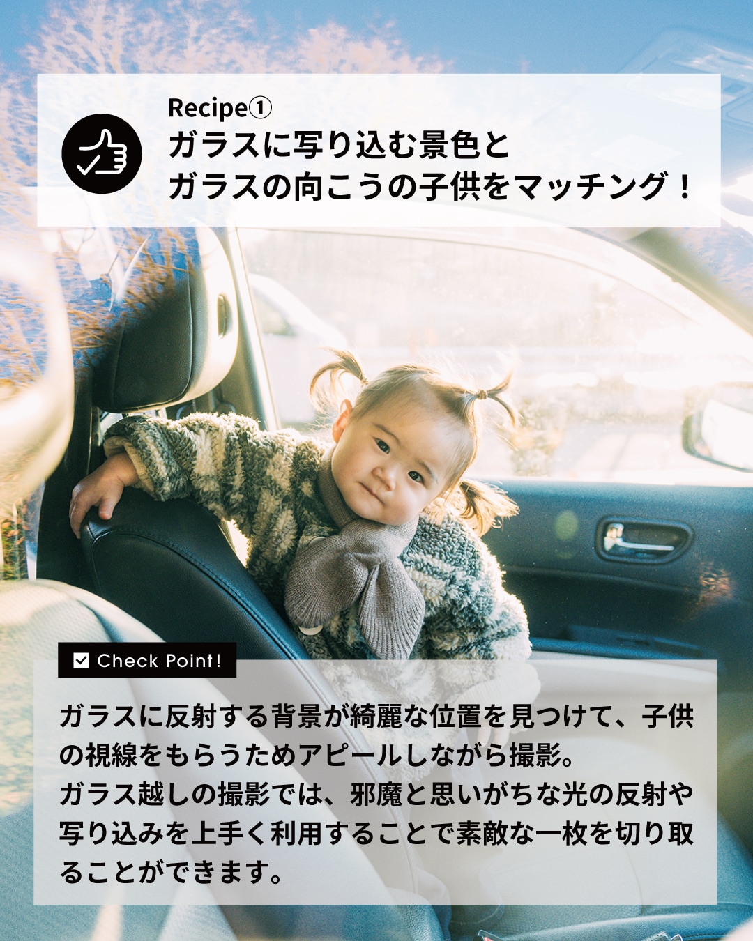 ガラスに反射する背景が綺麗な位置を見つけて、子供の視線をもらうためアピールしながら撮影。ガラス越しの撮影では、邪魔と思いがちな光の反射や写り込みを上手く利用することで素敵な一枚を切り取ることができます。