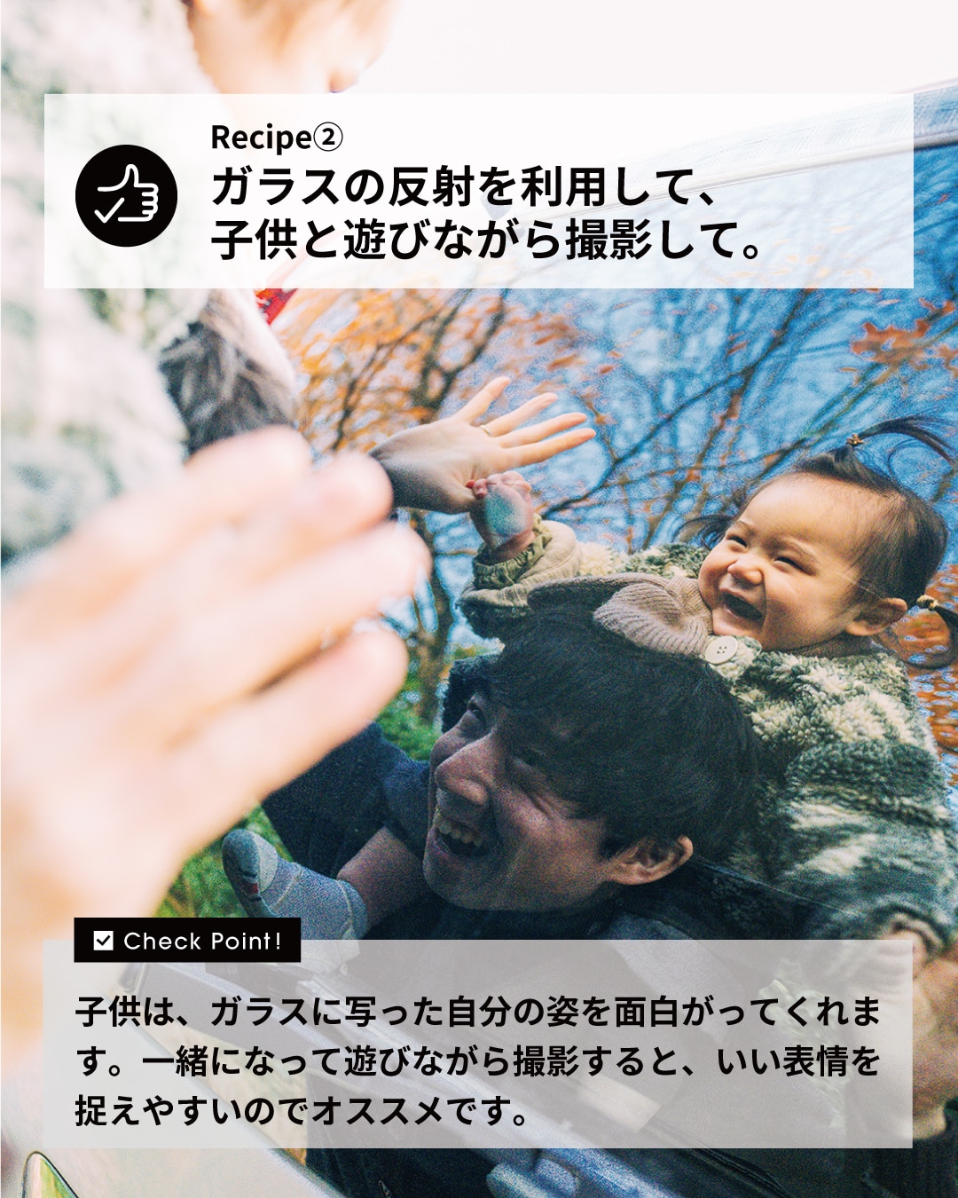 子供は、ガラスに写った自分の姿を面白がってくれます。一緒になって遊びながら撮影すると、いい表情を捉えやすいのでオススメです。