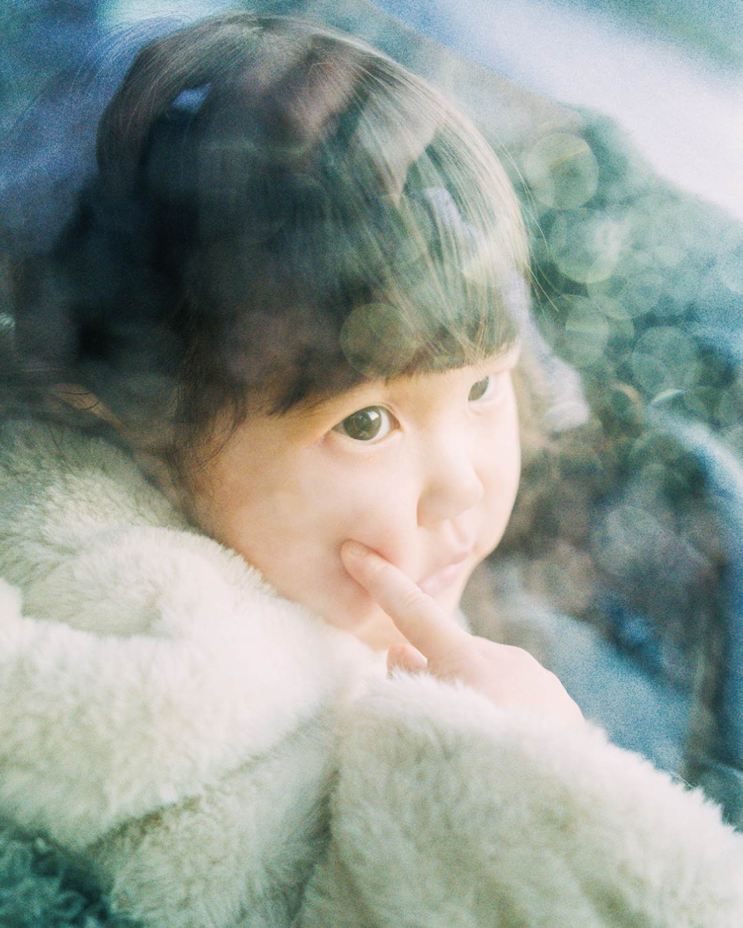ガラスに写り込む景色とガラスの向こうの子供をマッチング!