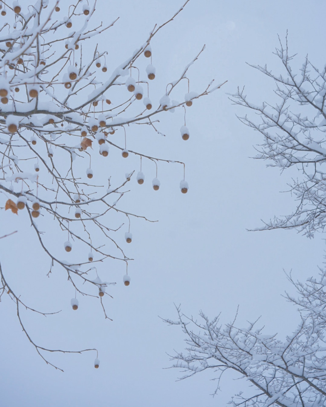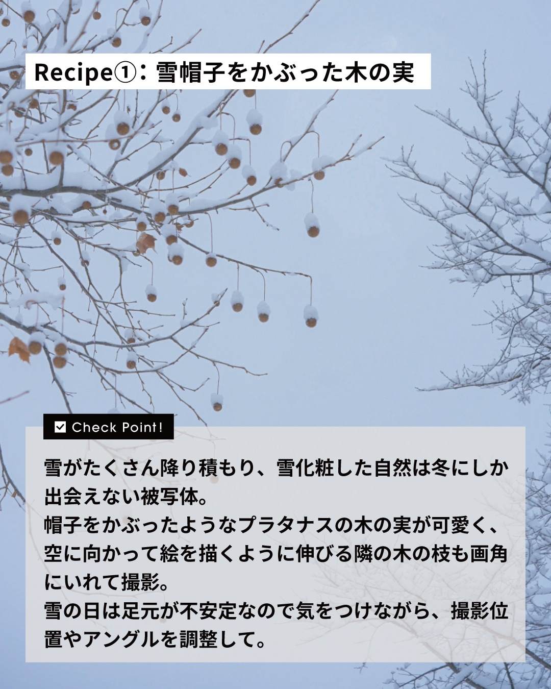 雪がたくさん降り積もり、雪化粧した自然は冬にしか出会えない被写体。帽子をかぶったようなプラタナスの木の実が可愛く、空に向かって絵を描くように伸びる隣の木の枝も画角にいれて撮影。雪の日は足元が不安定なので気をつけながら、撮影位置やアングルを調整して。