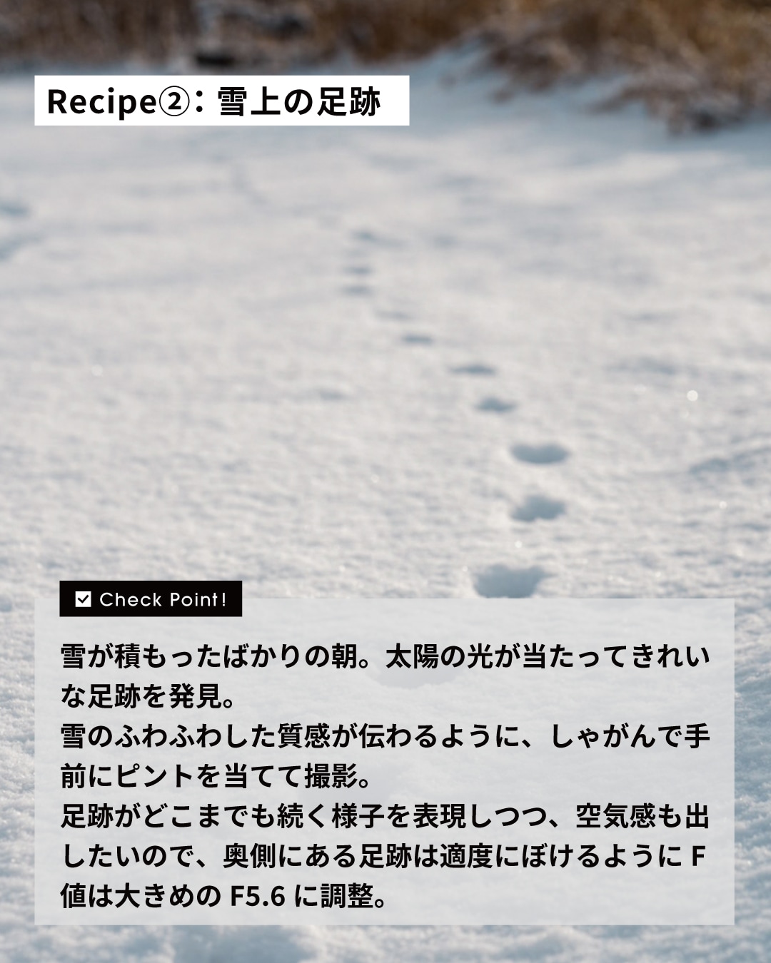 白銀の世界は、雪そのものだけでなく、光や陰影、空気感も表現できて奥深いです。あたたかい格好をして、撮影に挑んで!