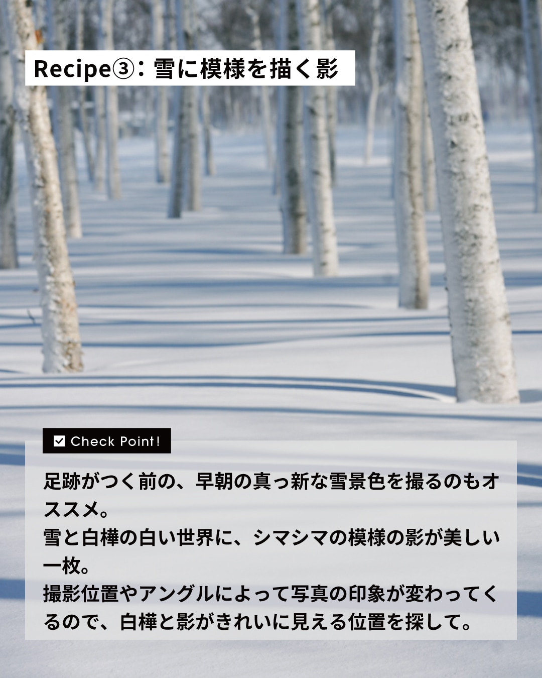 足跡がつく前の、早朝の真っ新な雪景色を撮るのもオススメ。雪と白樺の白い世界に、シマシマの模様の影が美しい一枚。撮影位置やアングルによって写真の印象が変わってくるので、白樺と影がきれいに見える位置を探して。