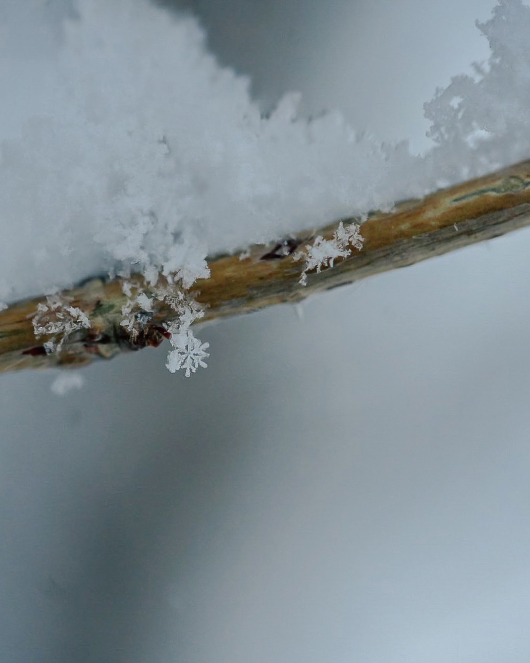 雪が降ったらチャレンジしたい雪の結晶の写真は、マクロレンズを使って、グッと被写体に近づいて撮って。雪の結晶のカタチは、気温や湿度、風などの気象条件で変わります。この写真の雪の結晶は、気温があまり下がらなかったためカタチがいびつですが、頑張ってぶら下がっている姿が可愛くて撮影。手持ちでマクロレンズを構える時は、シャッタースピードを速めに。通常のレンズよりも慎重にピント合わせるのがコツです。ピントが合ったか都度確認して何度も挑戦してみて。