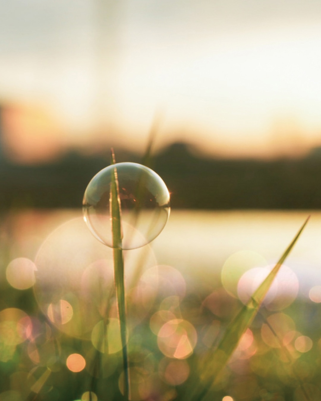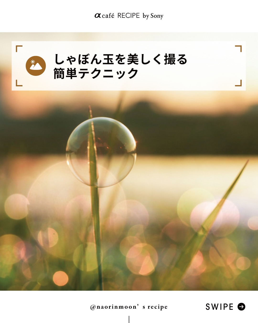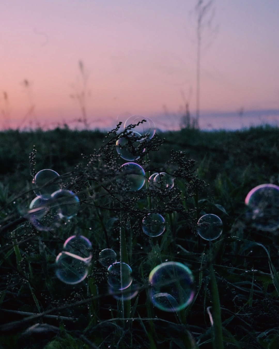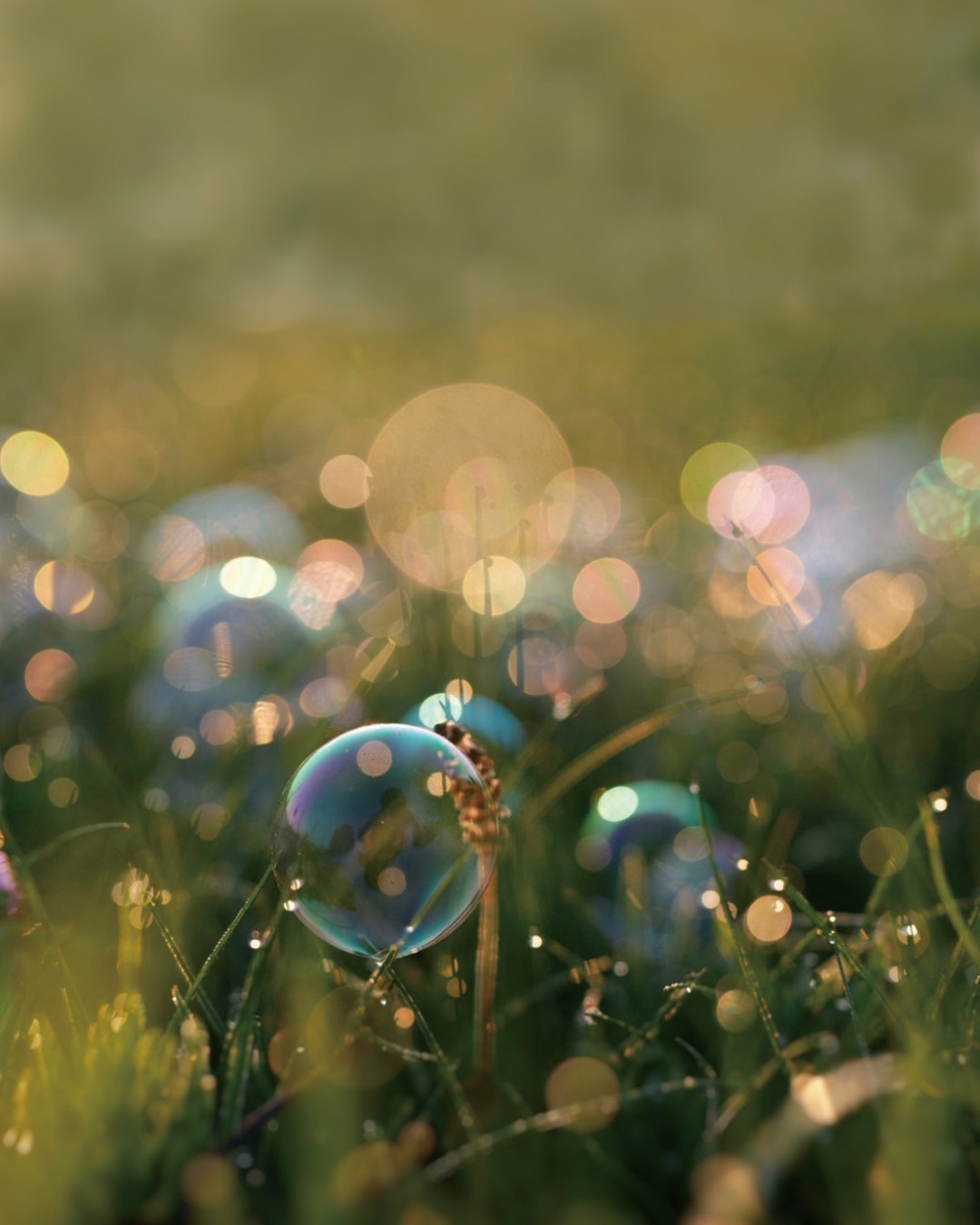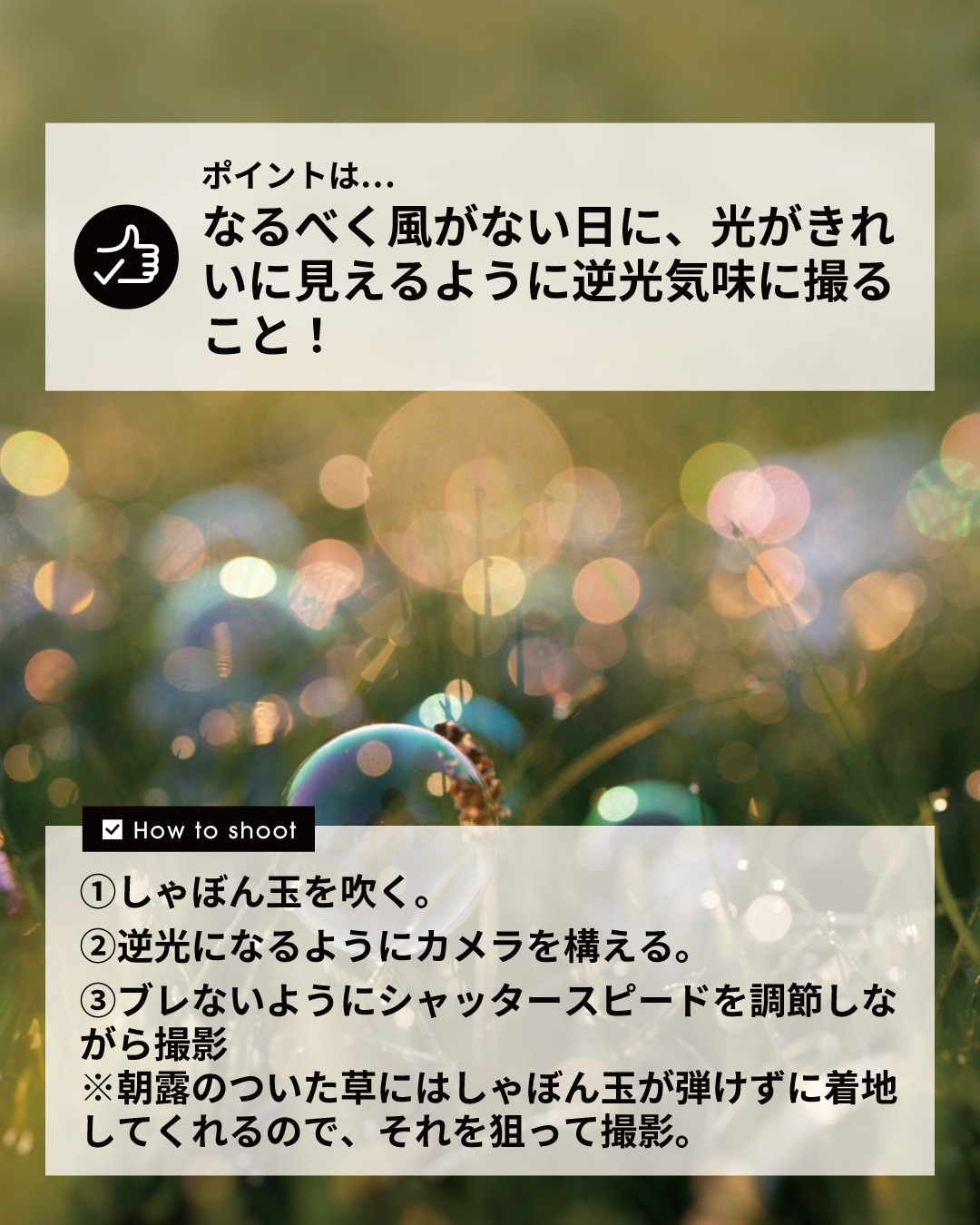 ※朝露のついた草にはしゃぼん玉が弾けずに着地してくれるので、それを狙って撮影。(芝生や花に大量に吹きかけると枯れる可能性があるので気をつけて。)