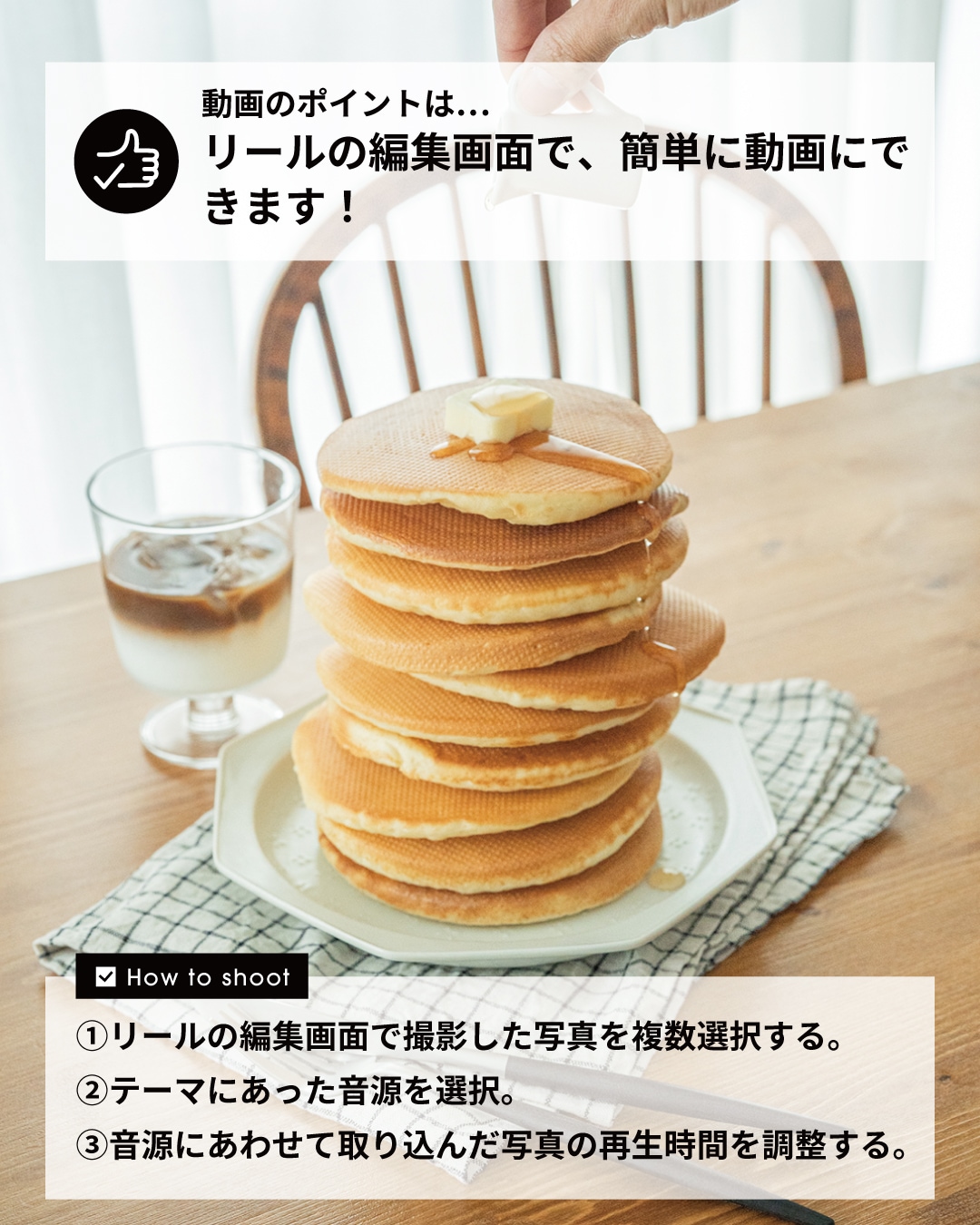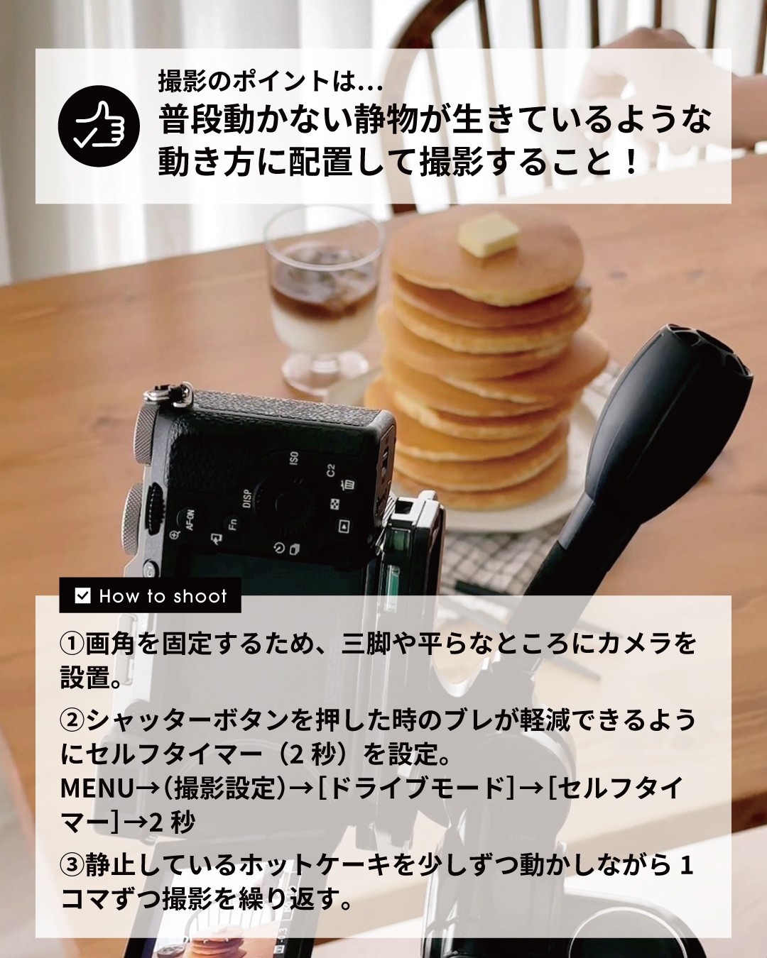 MENU→(撮影設定)→[ドライブモード]→[セルフタイマー]→2秒 - 静止しているホットケーキを少しずつ動かしながら1コマずつ撮影を繰り返す。