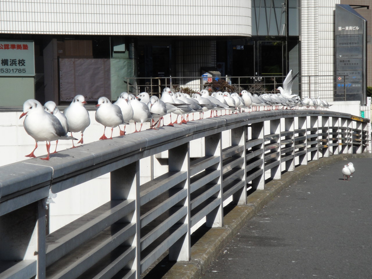 橋の欄干でカモメが行進していました。