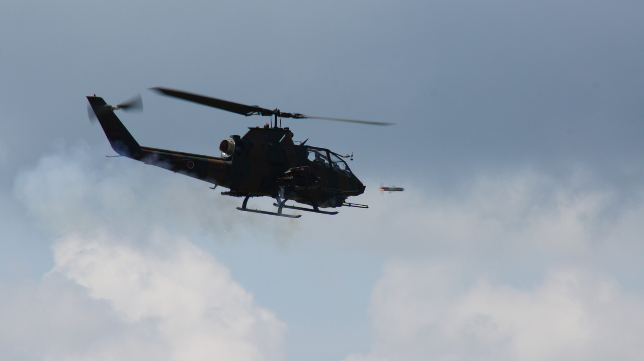 H22年総合火力演習より、AH-1のTOW対戦車ミサイル発射の瞬間。 よーく見るとミサイルの後ろに誘導用のワイヤーが見えます。