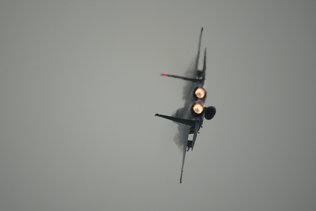 2009 エアフェスタ浜松にて この年、サンダーバーズが参加とあって、Fー15も気合十分でした。例年になく激しい機動飛行を見せてくれました。 惜しむらくは、雨で最低な状態でしたね。そのお陰か、ヴェイパー(飛行機雲)も激しく出てますが。 lens/minolta/single/AF Reflex500mmF8