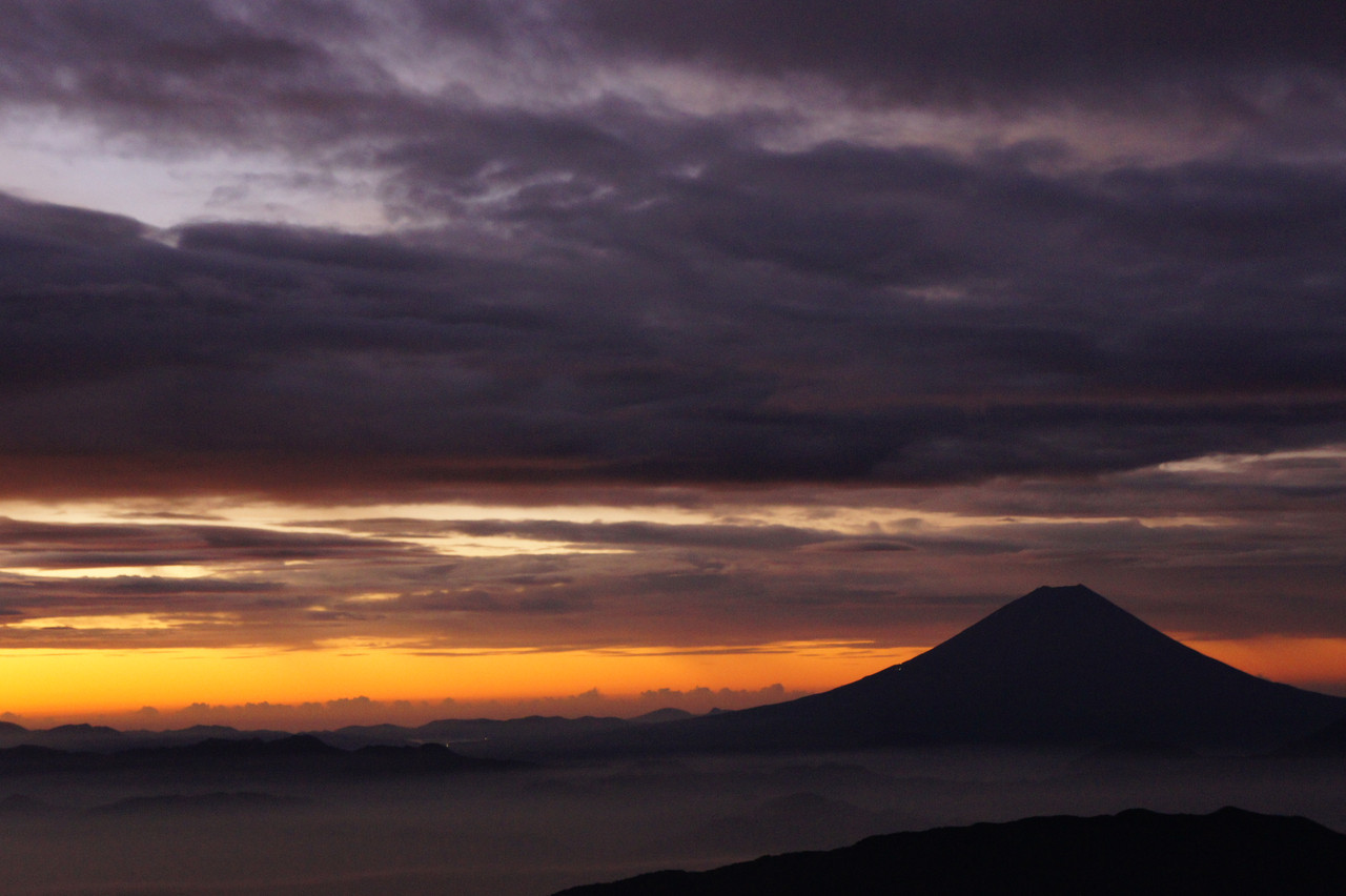 北岳でご来光を待つ。 富士山のシルエットが印象的でした。 あの頂上には沢山の人がご来光を待っているんだと思います。