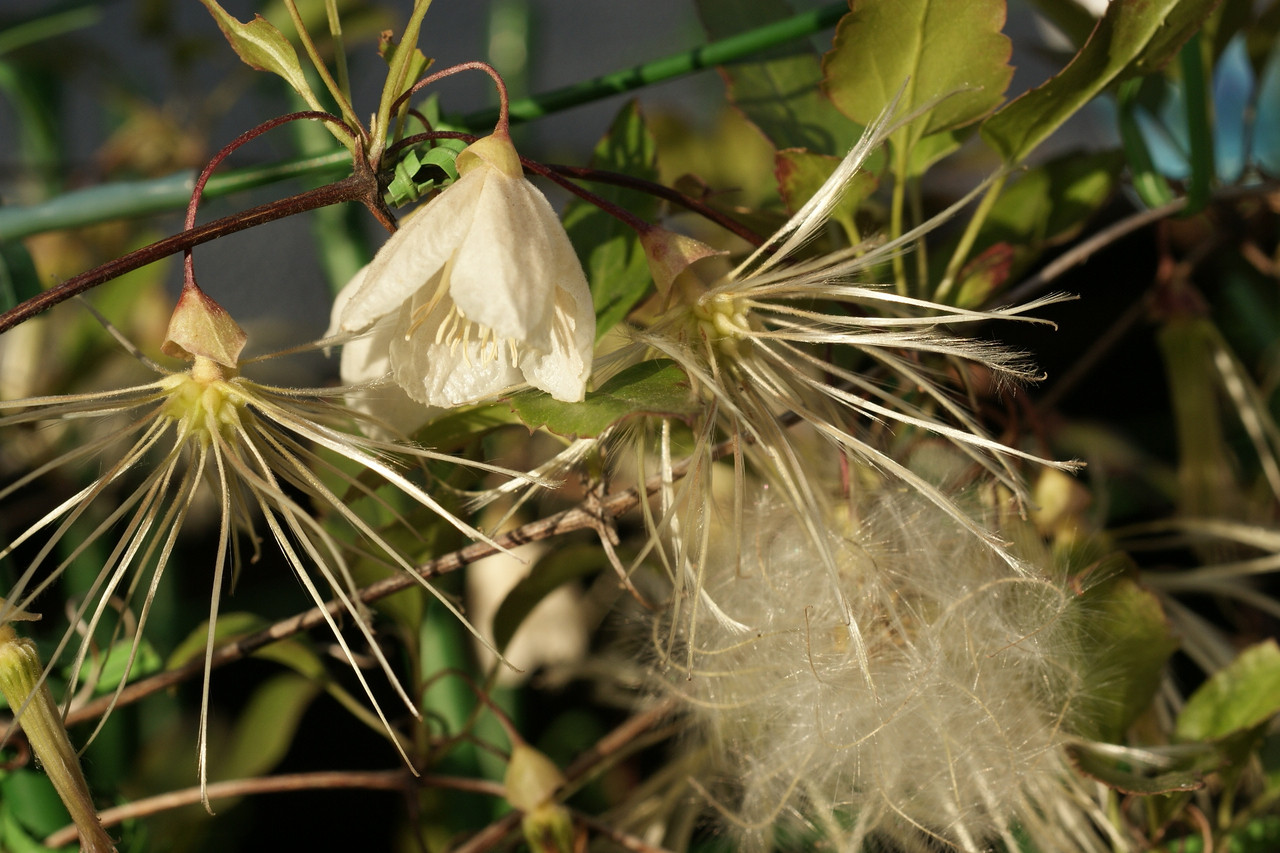 冬咲きクレマチス シルホサ・ジングルベルの花と果球