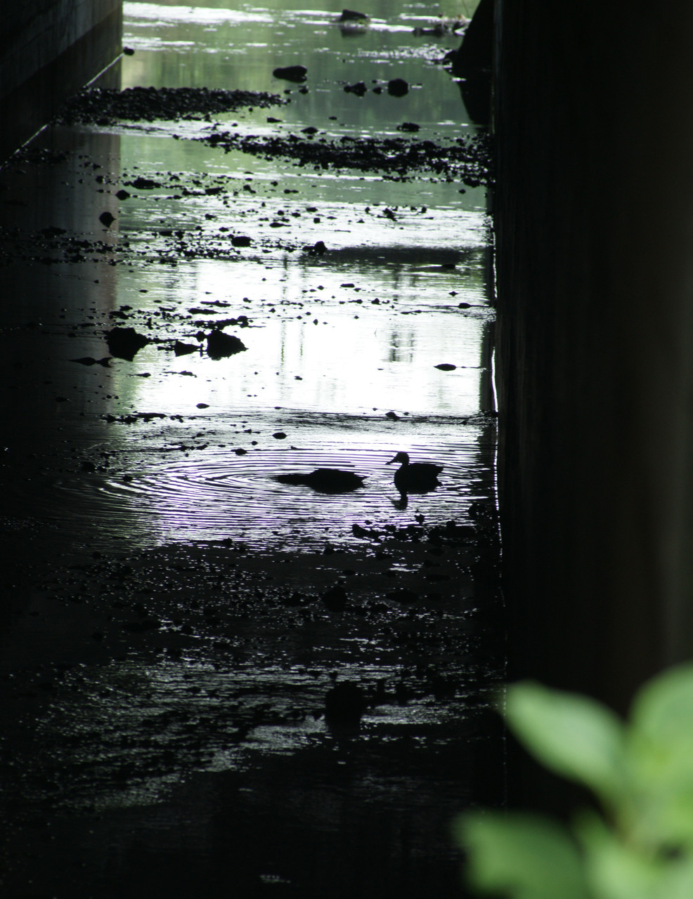 雨上がり 散歩の途中 ガード下の小川に二羽のカモが雨宿りをしながら遊んでいました ちょと遠かったのですが撮って見ました