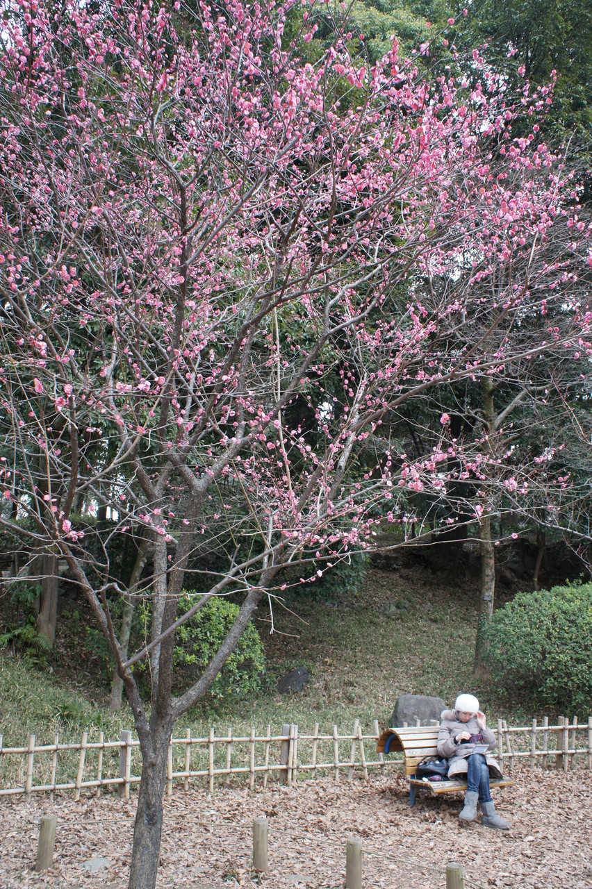 有栖川公園で撮りました。春にはほど遠いとても寒い日でしたが、梅が咲いている木の下で本を読んでいる外国人の女性が印象的でした。