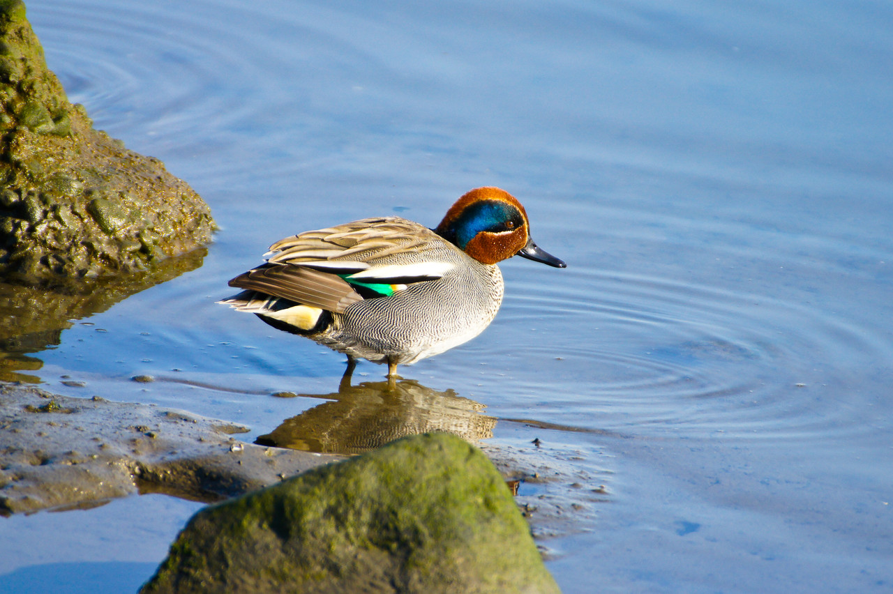2011年2月13日 多摩川六郷橋の下流の河川敷でコガモを撮影しました。 コガモは、カモ類の中でも綺麗な色をしていますね。