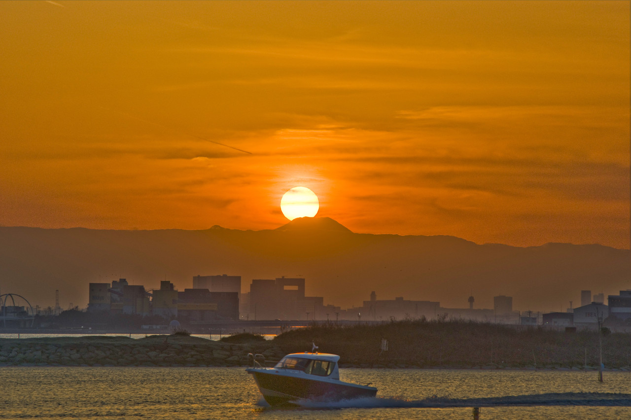 葛西臨海公園から見たダイヤモンド富士です。 モーターボートも花を添えてくれました。