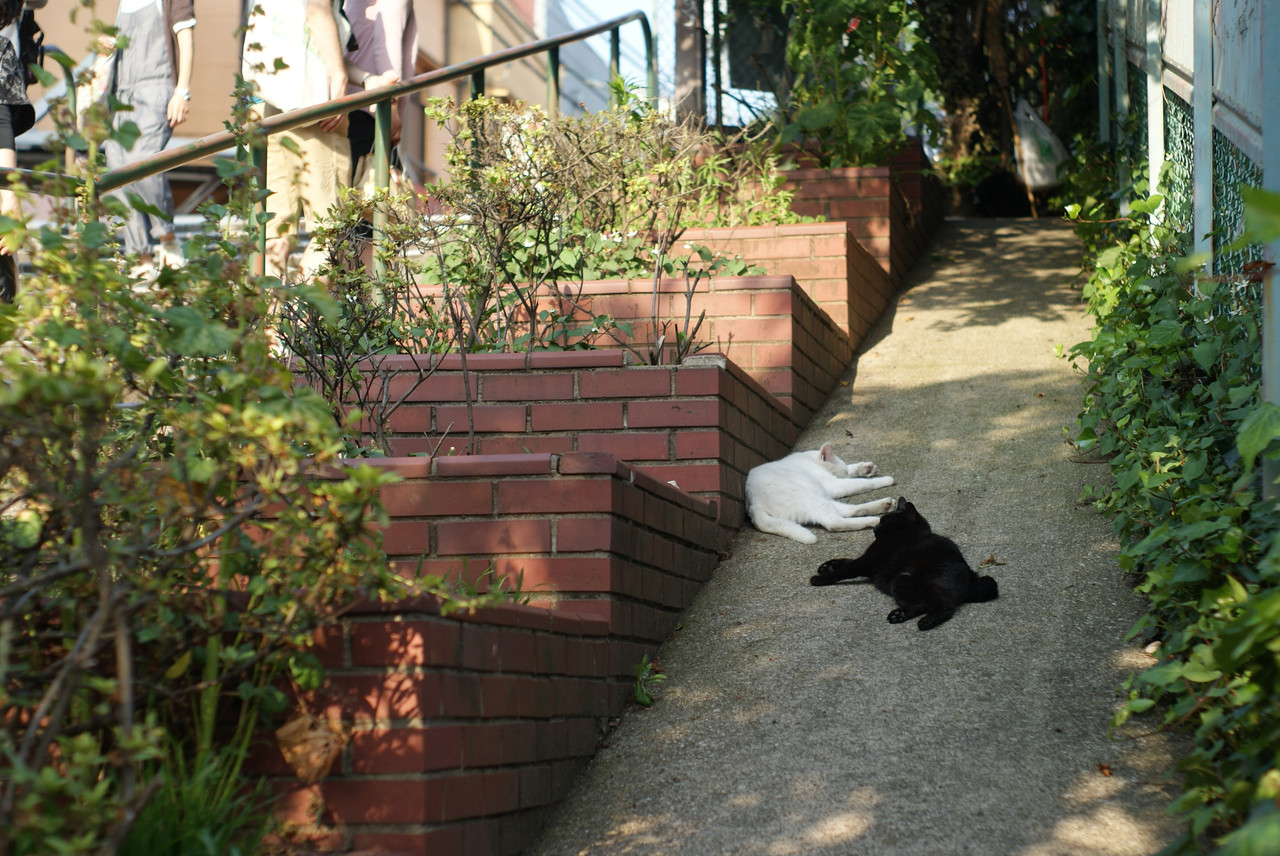谷中の夕焼けだんだんで、仲良く昼寝する二匹の猫。