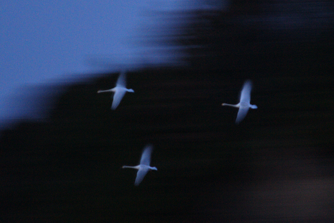 コハクチョウが、塒へ帰る為飛びました。 仲間を呼び合い、沼の端から水面を滑走し、飛び上がります。 一周二周と沼の周りを旋回して高度を付け、一気に山を越えます。 残念ながら、はっきりとは撮影出来ませんでしたが、幻想的な一枚に仕上がりました。