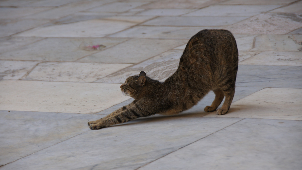 モロッコの古都フェズの旧市街スークの中にある、古い神学校の中の猫。 気持ちよさそうに背伸びをしています。砂糖と交換にローマから手に入れた大理石が敷き詰められています。 宗教の意味があると聞きましたが、モロッコには犬はあまりおらず猫ばかり。しかし同じイスラム国のトルコは犬ばかりでした。何故でしょうね。宗派の違いでしょうか。ご存知の方いたら教えてください。