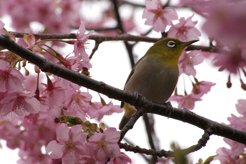 メジロが多く飛んでいて、止まり木になった桜を見つけて撮りました。 何羽もいたのでシャッターチャンスは多いと思ったのですが、隣のおじさんが携帯で写真を撮った時の大きなシャッター音でみんな飛んで行っちゃいました。 3枚撮った内の1枚です。