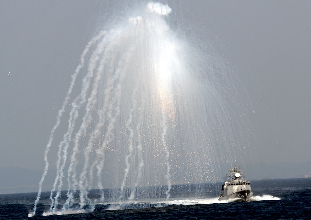 ミサイル艇が頭上にフレアーを発射! 火の子が降り注ぐ中回避行動を行います。 ちょっと望遠でも遠い写真になってしまいましたが。