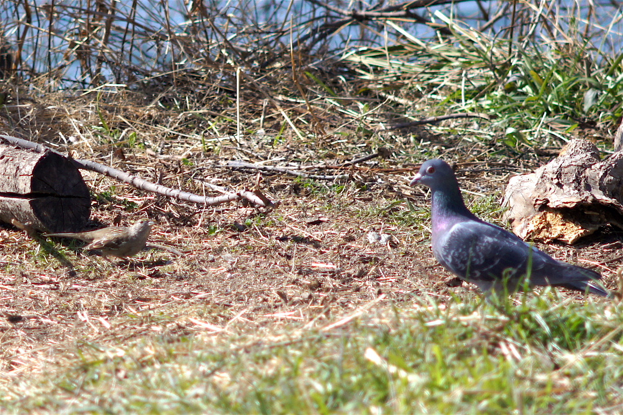 鳩と珍鳥・キガシラシトド。日本に渡ってこない珍鳥なだけに、鳩も驚いた??