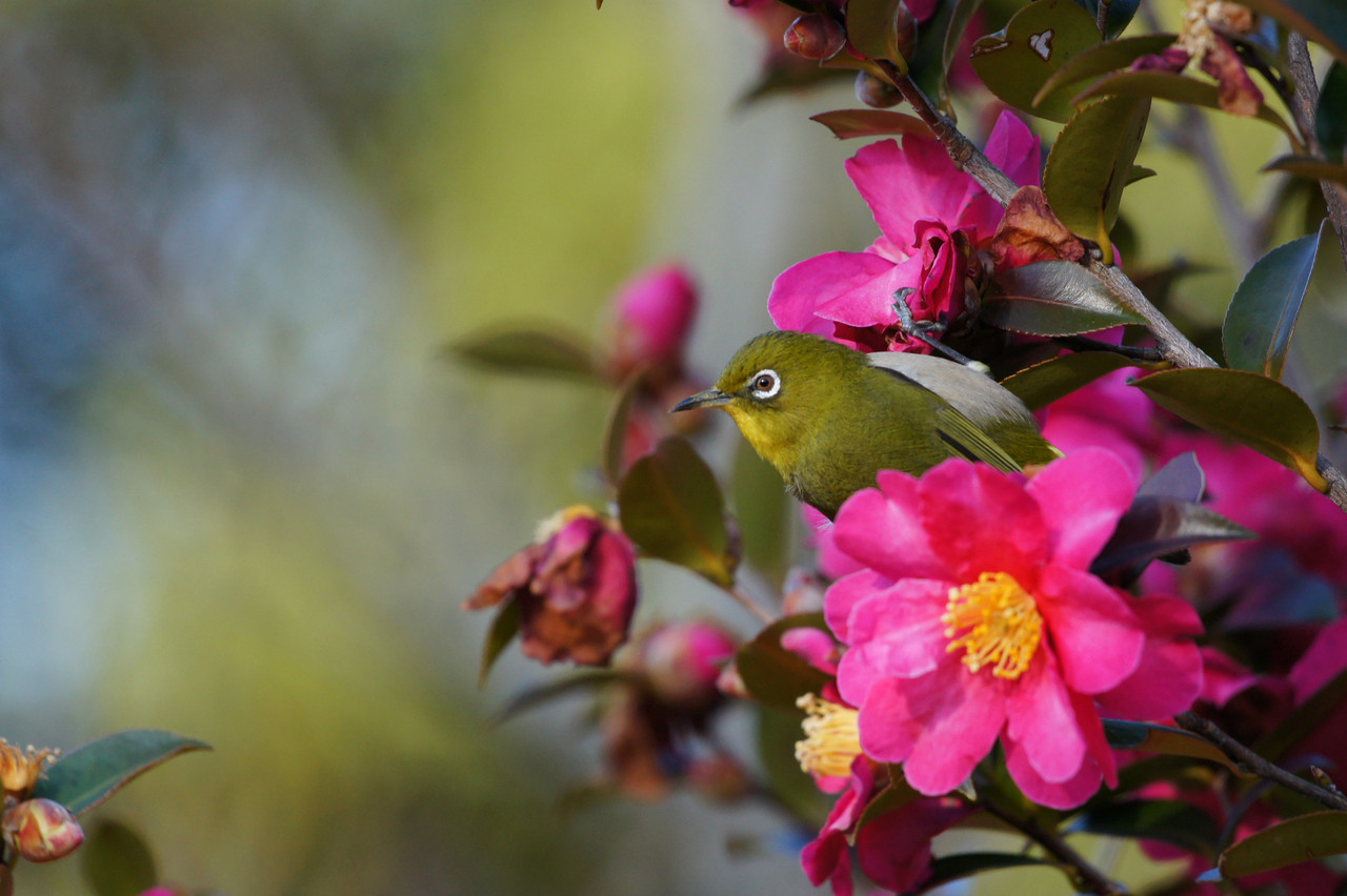椿の蜜を吸いに来たメジロの姿を捉えました。