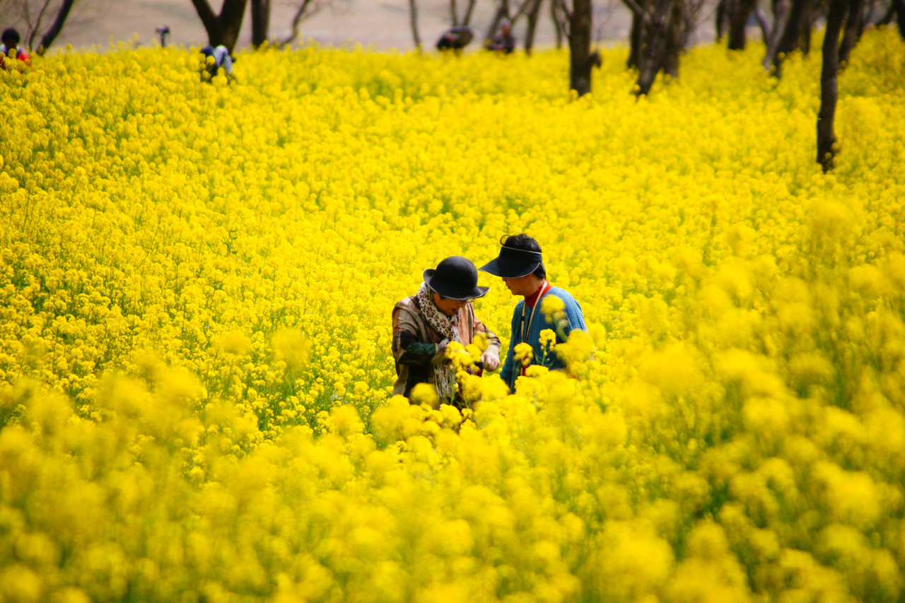 菜の花に取り囲まれて埋る中に二人連れ 何だかほのぼのと若く観て撮れる。