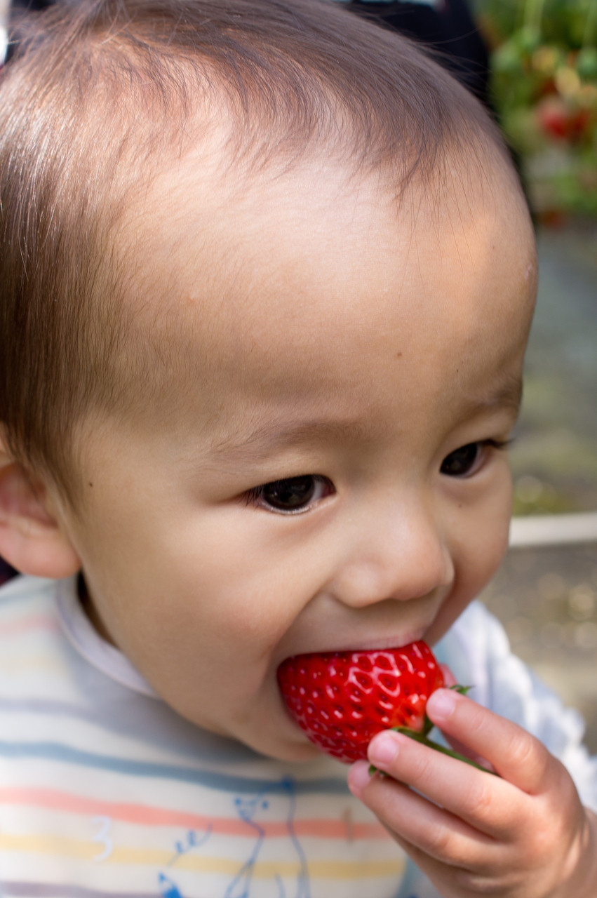イチゴ狩りにて。とっさに構えて撮影したので、手ぶれの写真でした。でもカブリついている写真で、どうにかこうにか使えそうなのがこれしかなくて残念。 それにしても、なんで子供はちょっとずつかじって食べればいいのに、まず丸呑みを第一選択とするんだろうか・・・。苦しいだろうに。