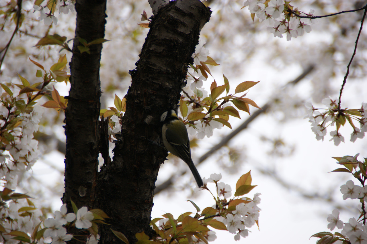 桜の幹の何を食べているのかわからないのですが、幹をついばんでいたシジュウカラがちょっと休憩したところ。 鳥にはソメイヨシノより山桜や大島桜のほうが人気あります。
