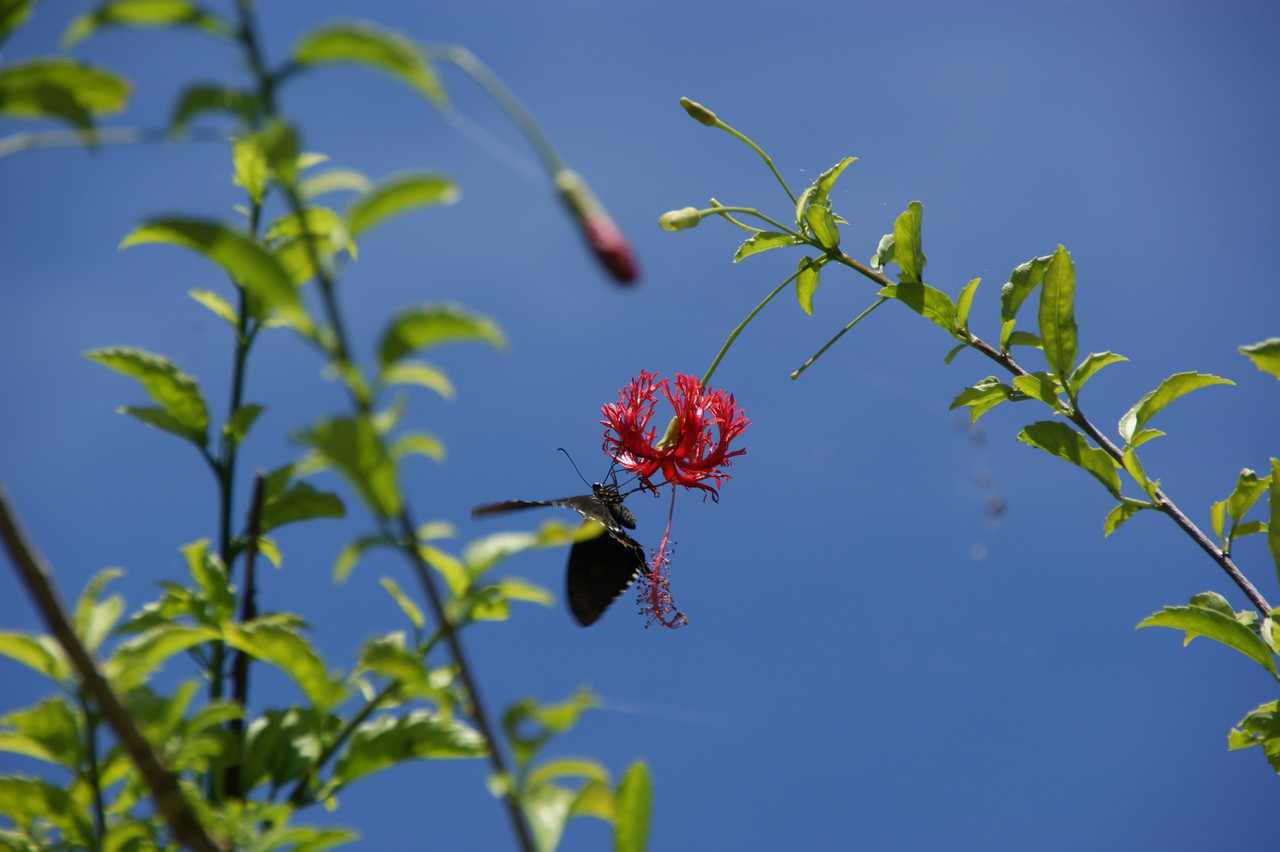 これも沖縄らしくツリバナ(ハイビスカス)にとまったシロオビアゲハ。花もさることながら、バックの空の青もまぶしいですが、それらに負けないくらい存在感のあるチョウです。
