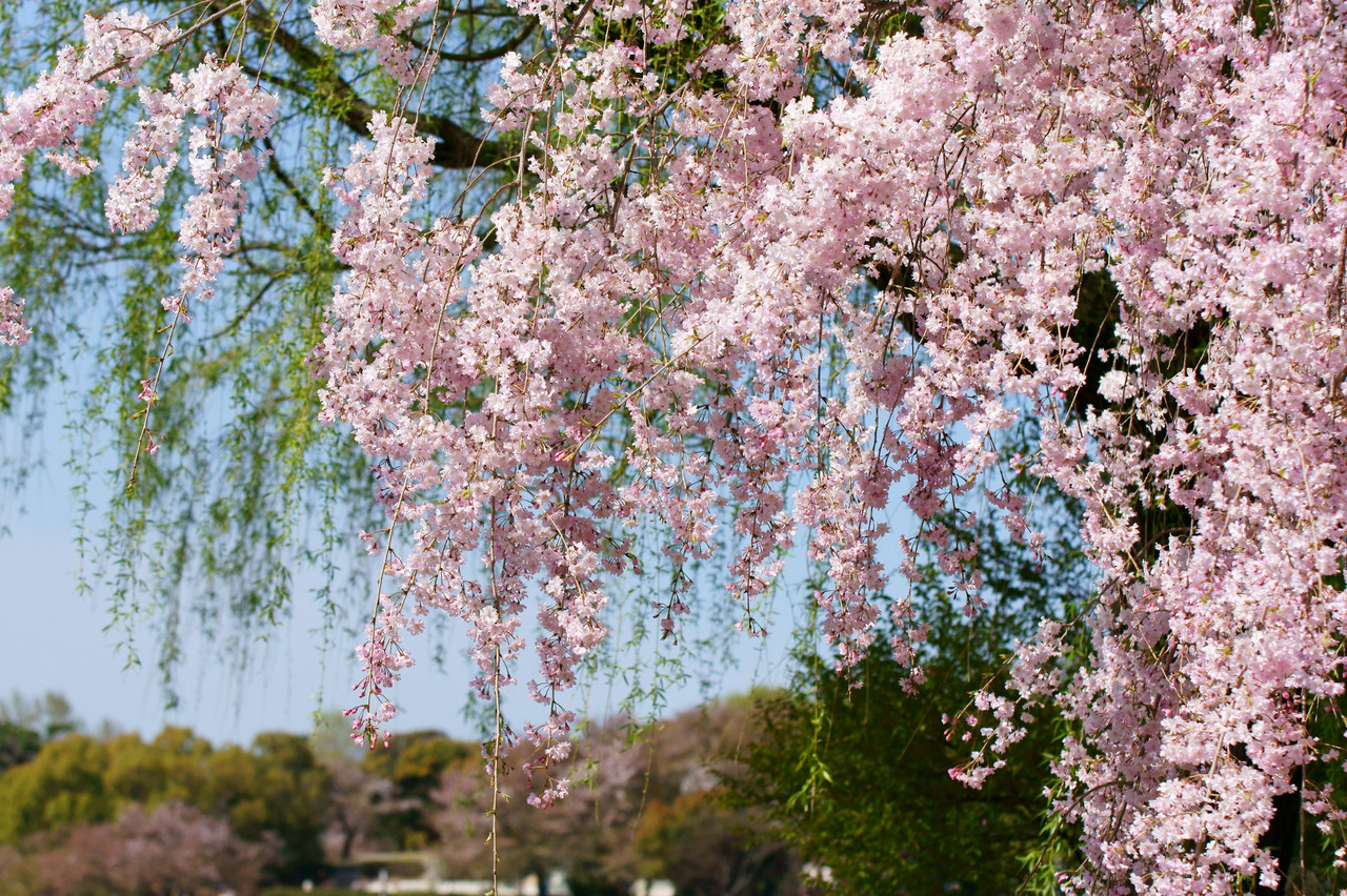 公園の池のほとりに華やかな枝垂れ桜が満開になっていました。私のお気に入りの場所です。