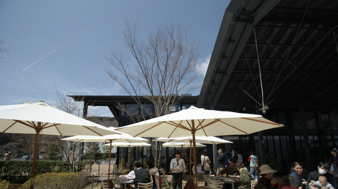 キャンバス布のパラソルが青い空と湖に映え、少し肌寒かったですが「、すがすがしい一日でした。