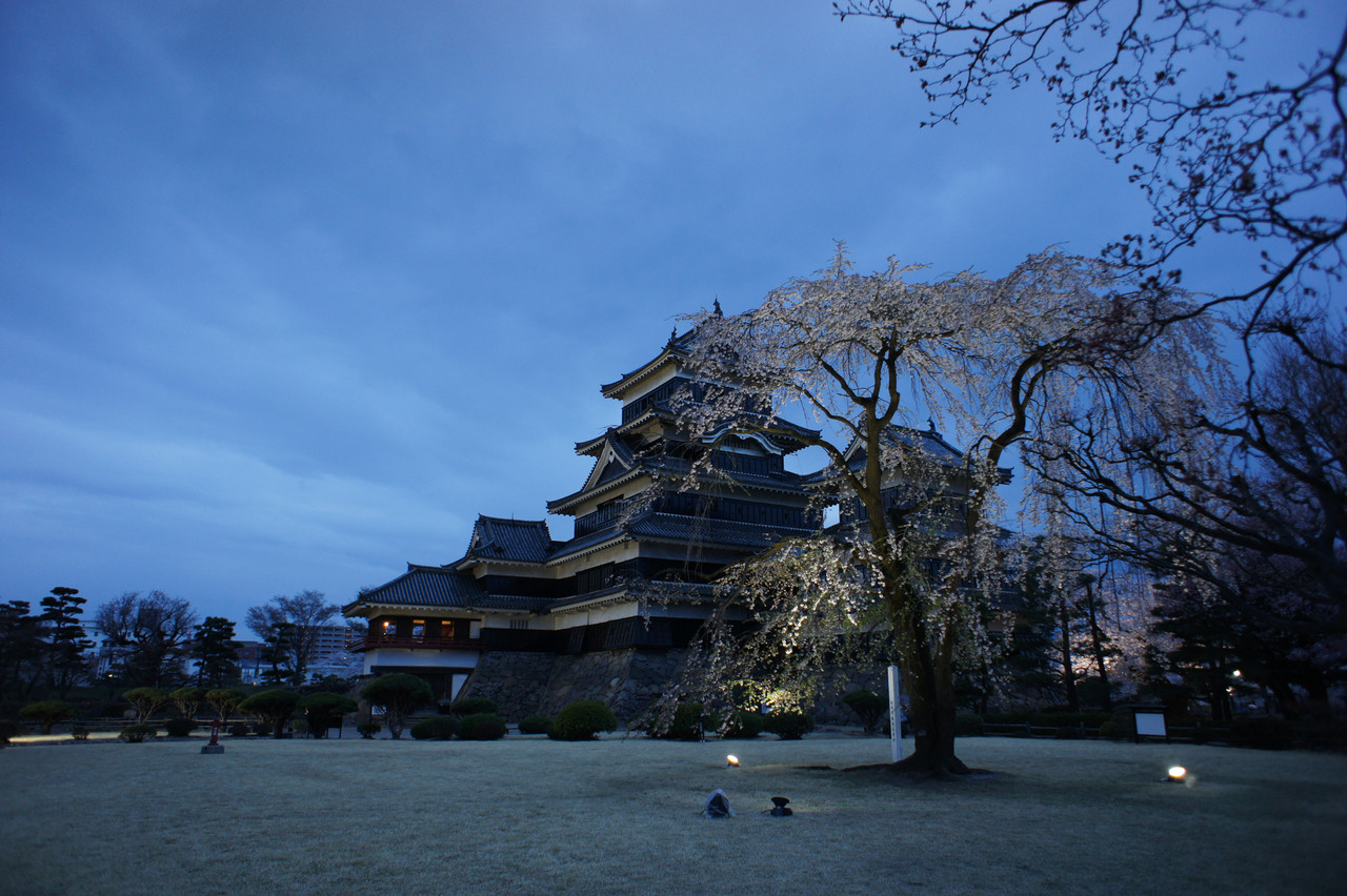 松本城で夜桜会として本丸庭園を夜間無料開放していました。雨が降り出したのでこれにて退散しました