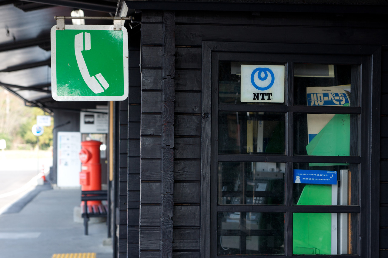 阿蘇駅にある公衆電話。 黒塗りの電話ボックスが渋くていい感じ。