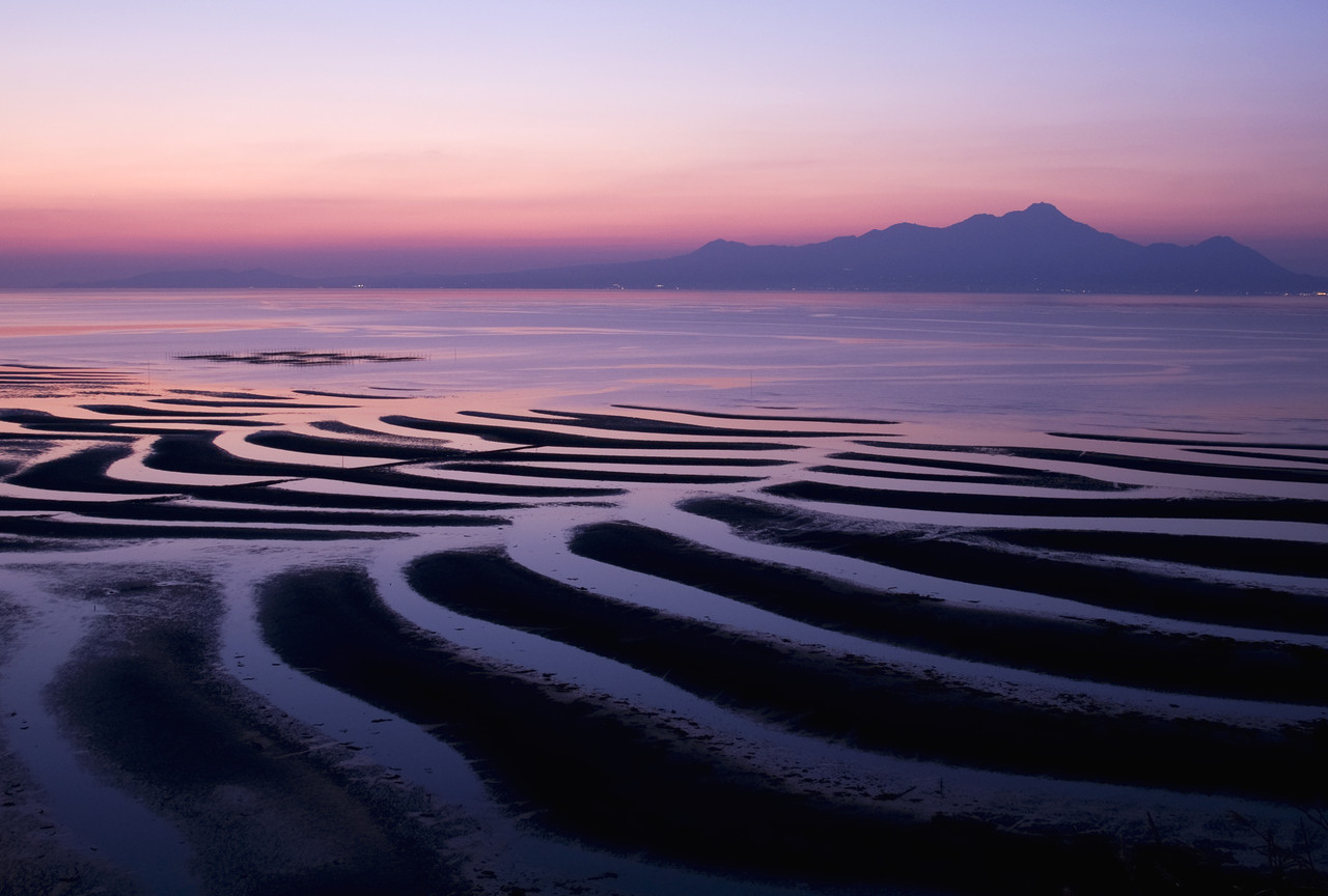干潮時に現れる干潟の紋様を普賢岳を背景にした夕景の御興来海岸です