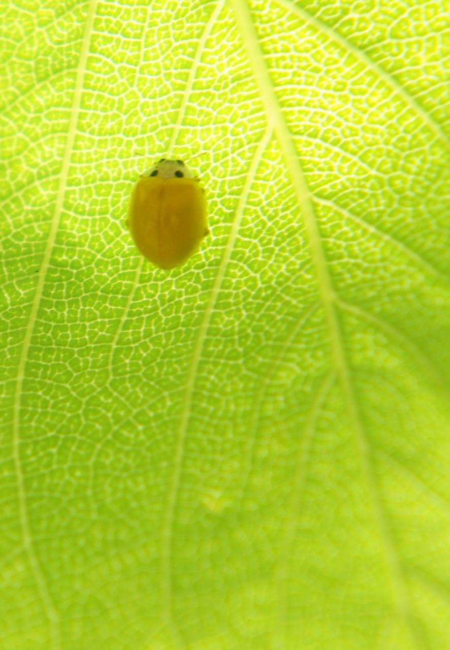 キイロテントウが桜の葉の裏側に隠れていました。 うどんこ病の菌を食べる変わったやつです。