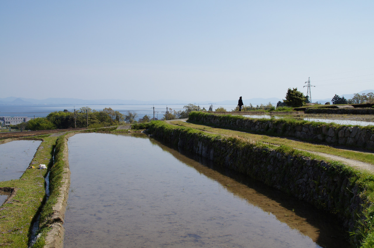 鵜川の棚田です。 石垣と棚田と琵琶湖と電車が 同時に撮れます。